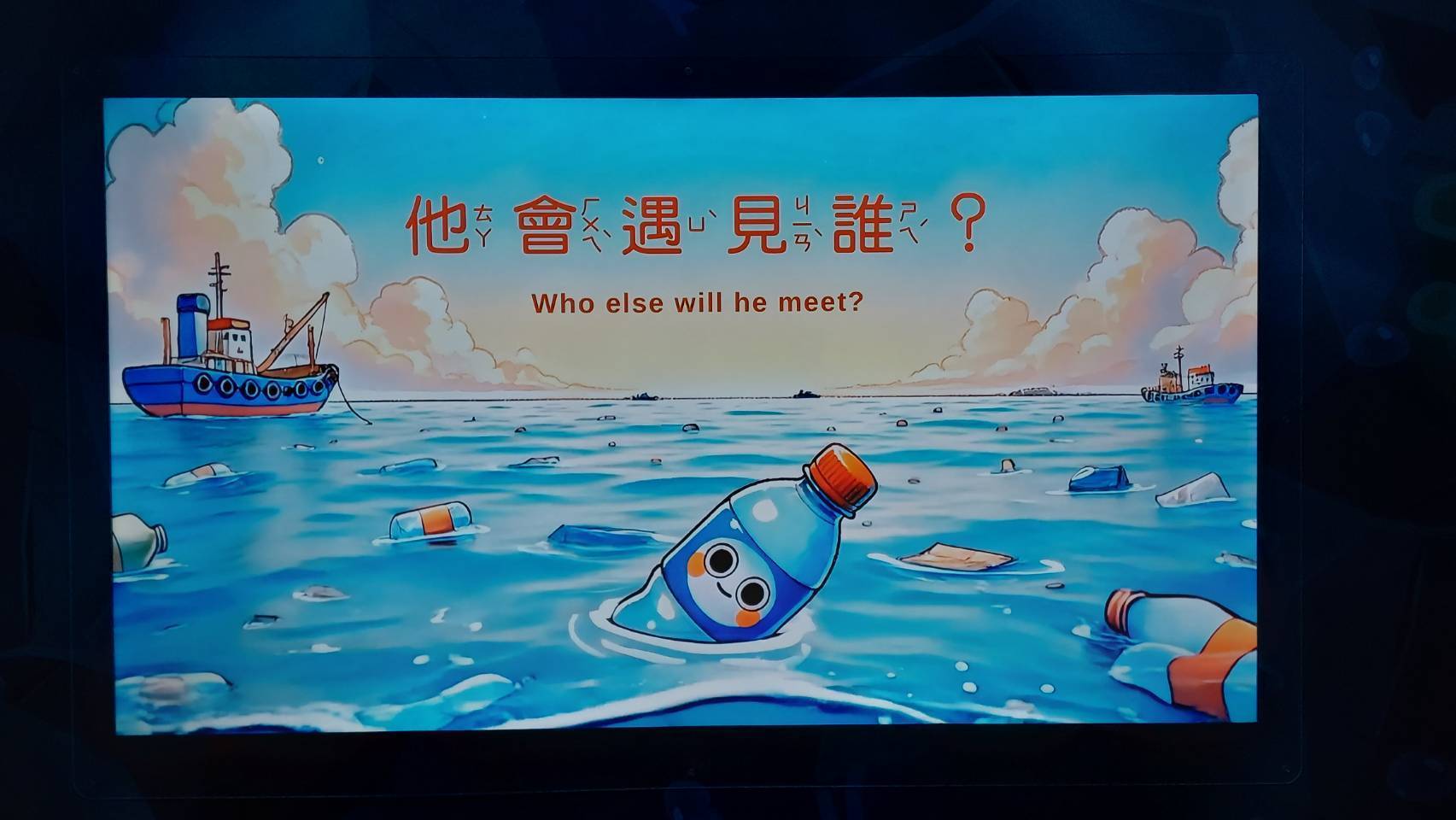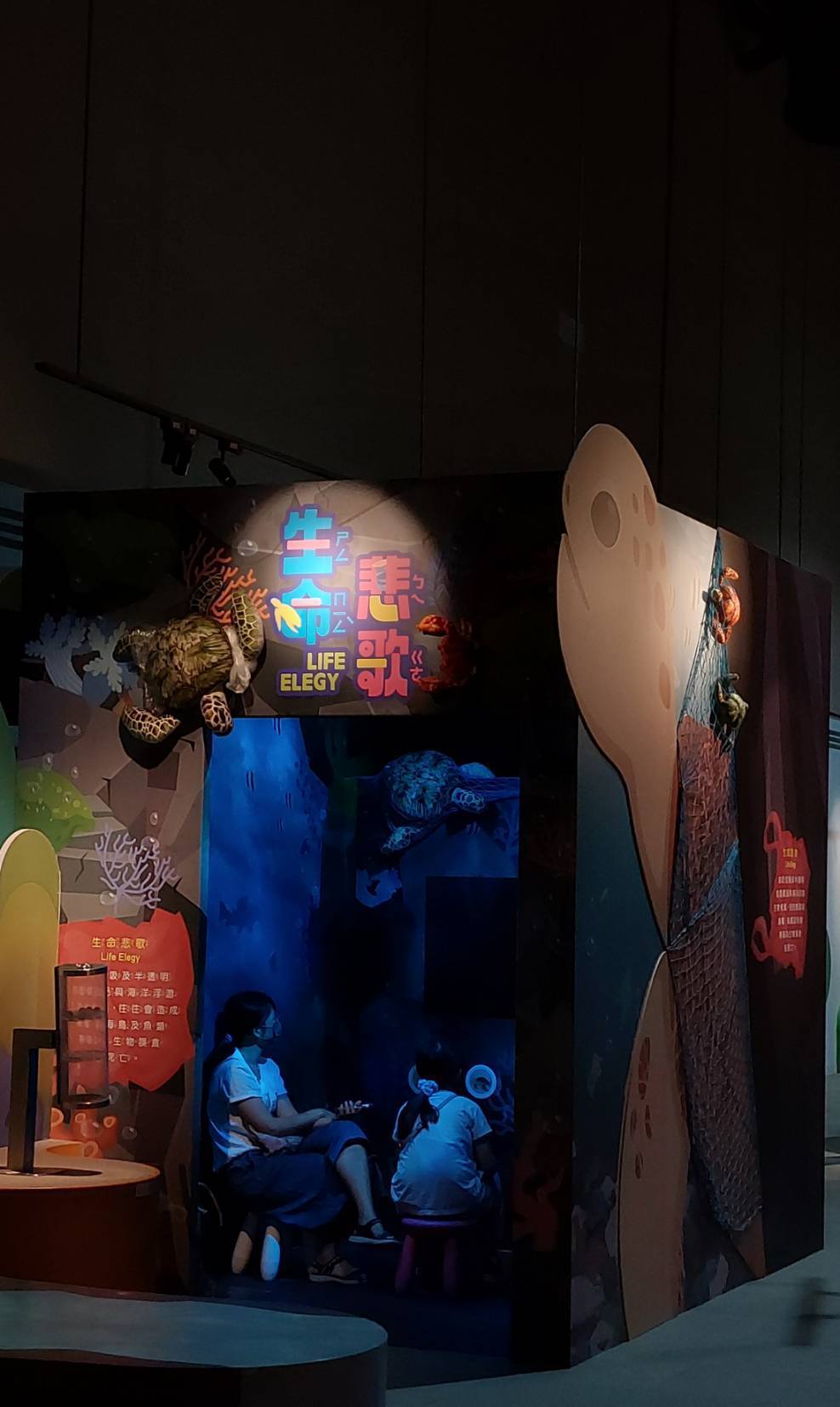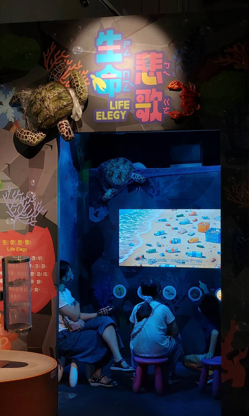 展區特別設計為一座沉靜低光的小劇場,觀眾可席地而坐甚至仰躺觀賞,宛如置身海底。整體展演分為五段影片,分別由觀眾按下對應的互動按鈕來啟動,每段故事皆由生動的旁白與溫潤的畫風引領,讓大小朋友在感性共鳴中理解垃圾問題的嚴重性。