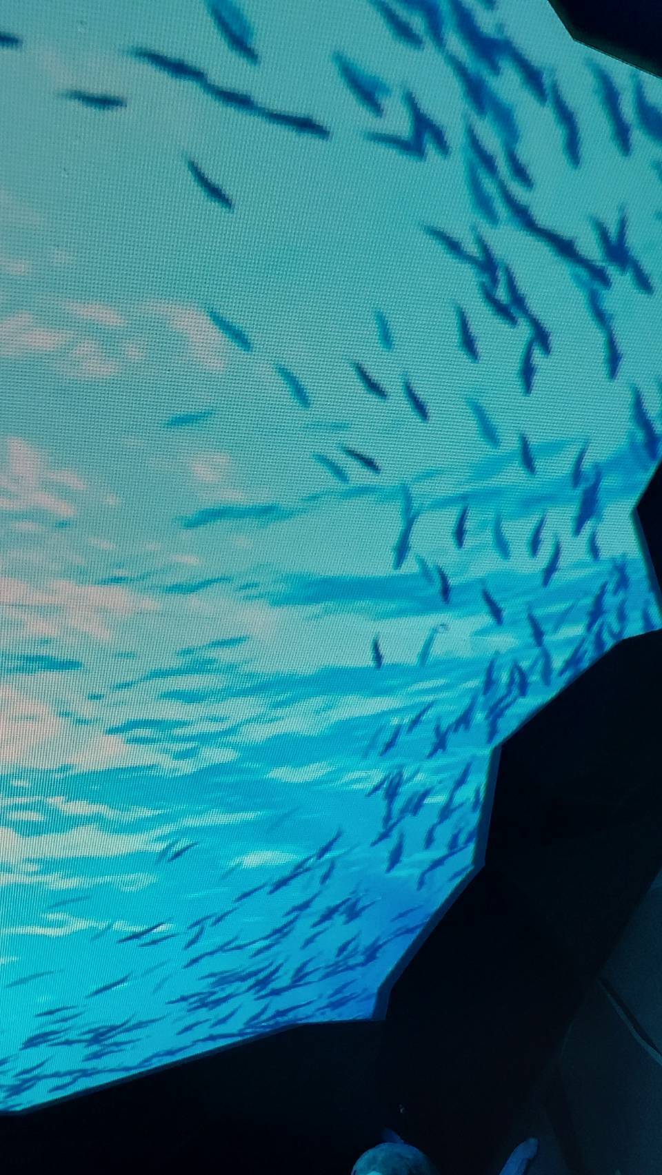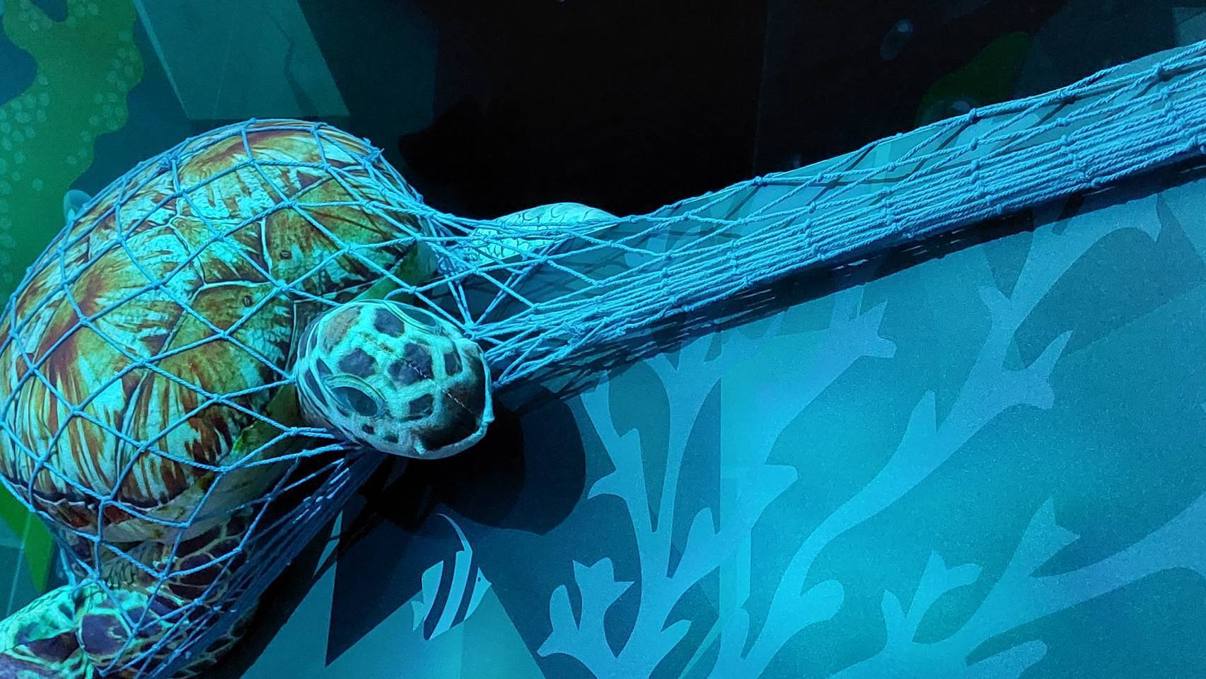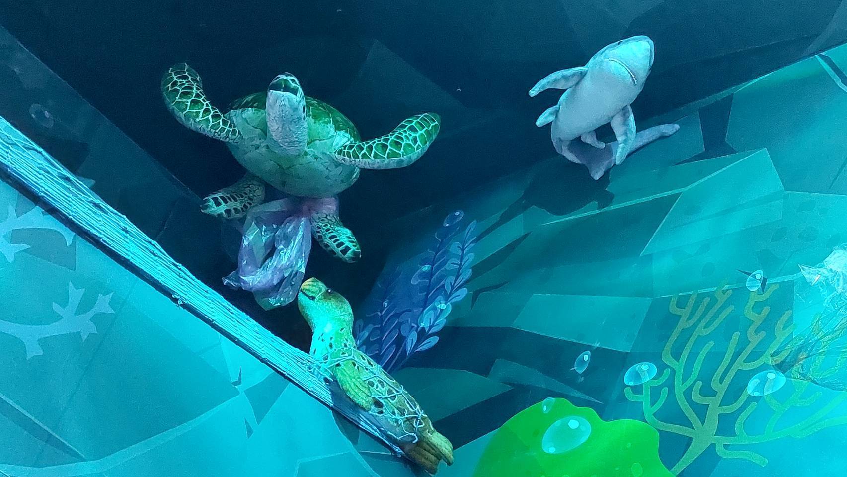 展區特別設計為一座沉靜低光的小劇場,觀眾可席地而坐甚至仰躺觀賞,宛如置身海底。整體展演分為五段影片,分別由觀眾按下對應的互動按鈕來啟動,每段故事皆由生動的旁白與溫潤的畫風引領,讓大小朋友在感性共鳴中理解垃圾問題的嚴重性。