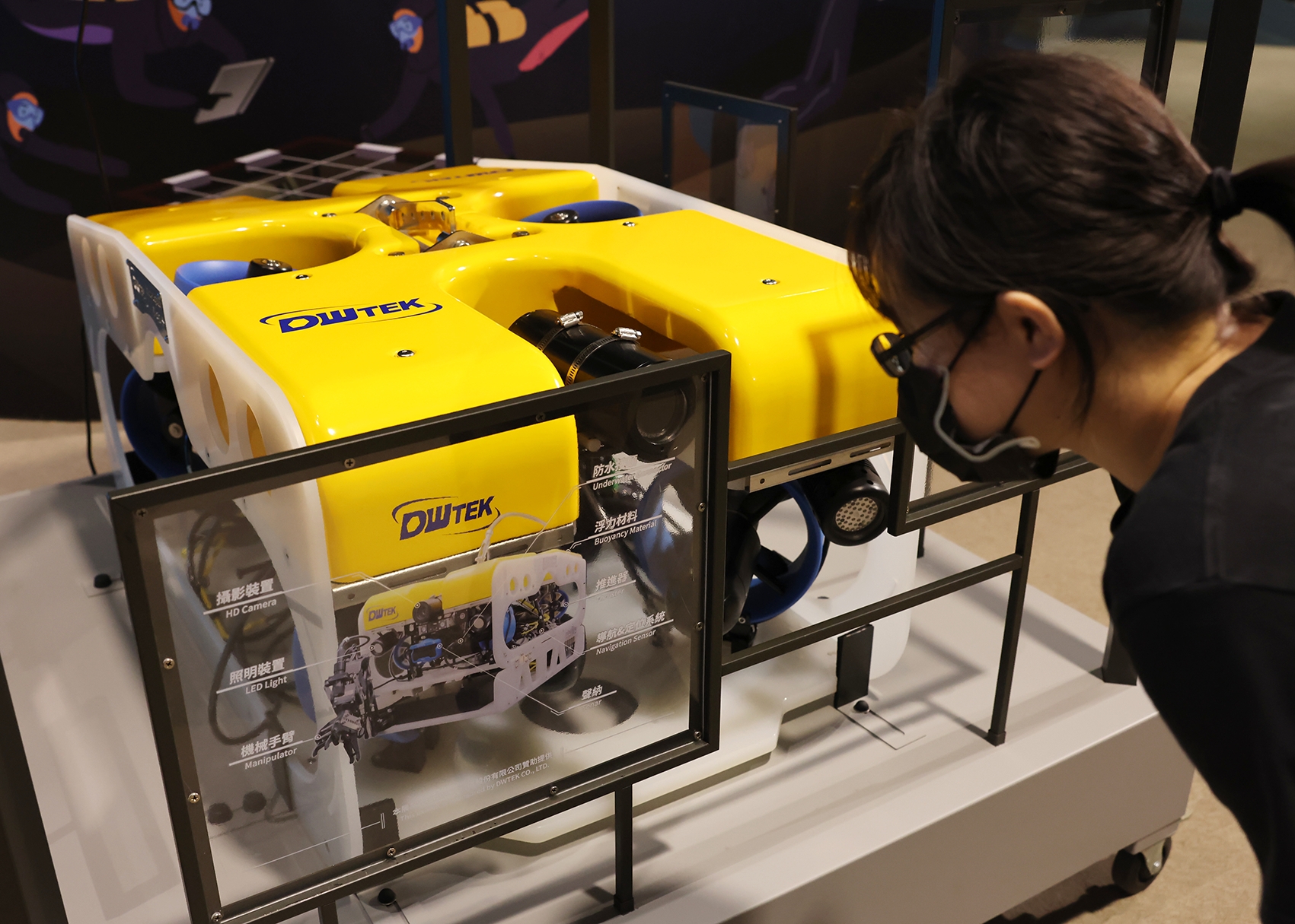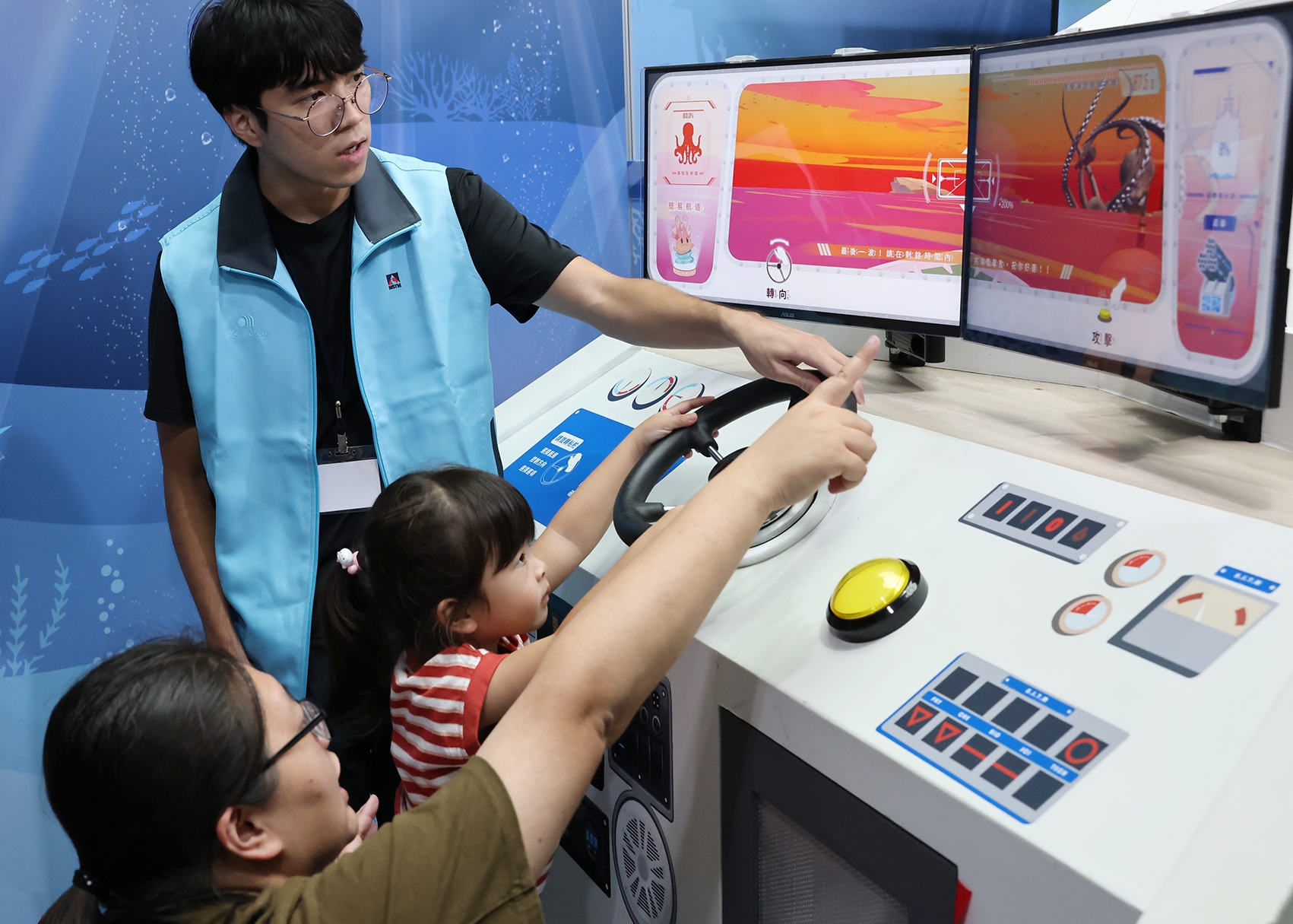 其中值得特別介紹的是「水下無人載具(ROV)的奇幻之旅」,它是一種由遙控操作、不需載人的水下機器人,它「不怕高壓、耐得住黑暗」,搭載攝影鏡頭、機械手臂與各式感測器,能深入人類難以到達的深海區域,協助進行海洋科研、資源探勘,甚至水下施工。現在玉豐海洋科儀股份有限公司設計的真實機體就在現場展出,邀你近距離感受深海探索的魅力!這套互動教具中,玩家將化身為水下無人載具操控員,透過模擬操作台,遠端指揮無人載具執行任務與挑戰。教具設有「風機檢修」與「深海探勘」兩大關卡,帶領玩家體驗遠距操作、水下攝影、探測與採集等任務,深入了解水下無人載具的多元功能與實際應用,從中學習科技如何協助人類探索神秘海洋!