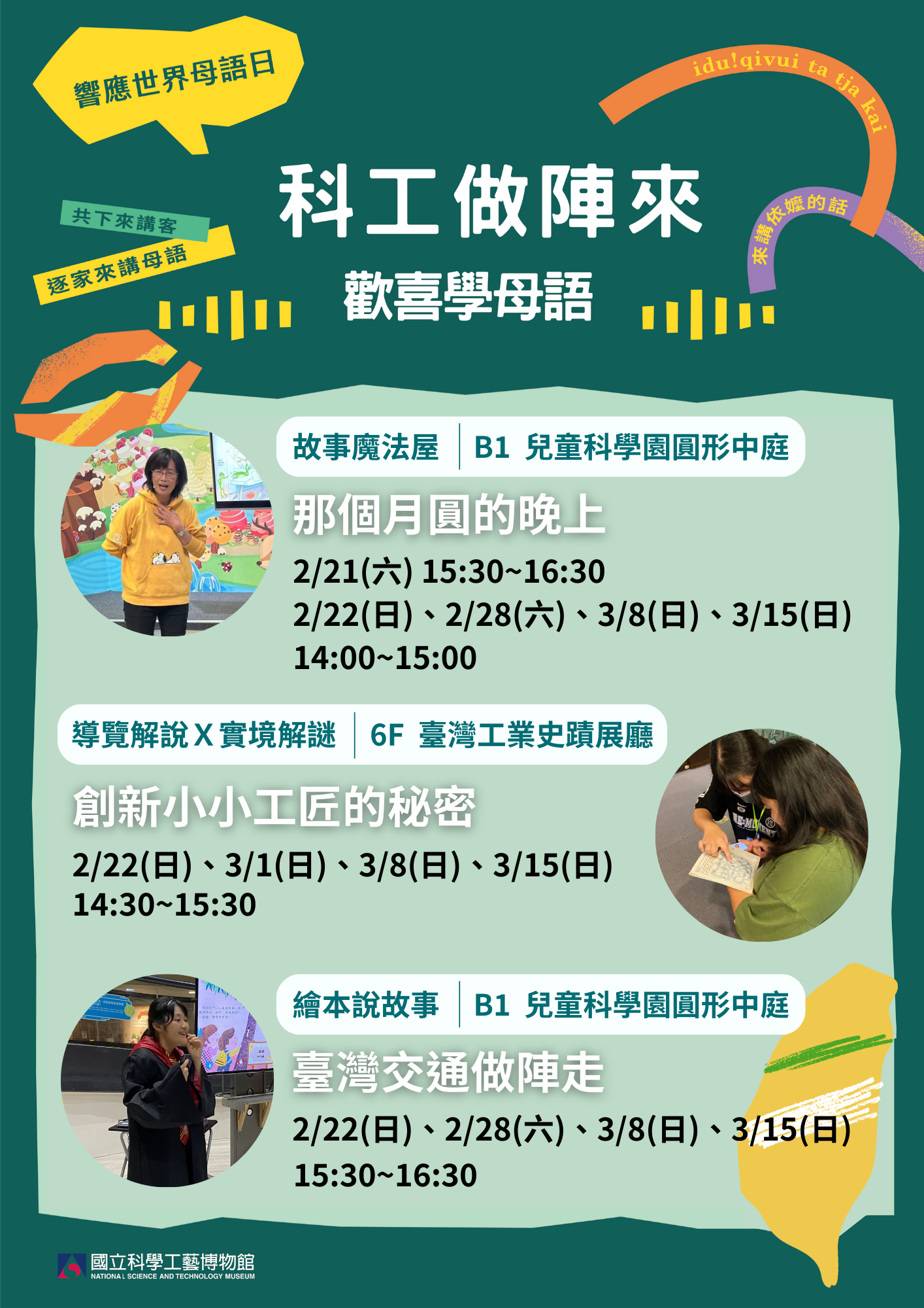 為響應「世界母語日」並營造國家語言友善環境,2、3月份規劃系列推廣活動。透過本土語言導覽、繪本導讀及手作體驗,將科學與文化傳承緊密結合。