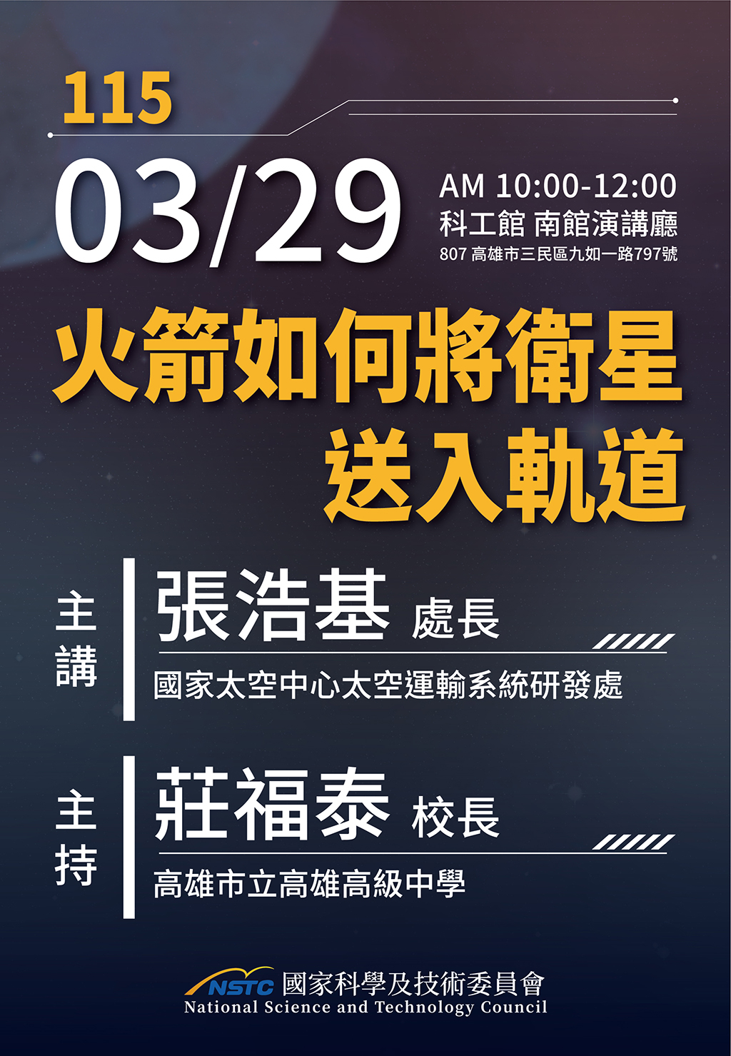 在這場講座中,講者將由衛星任務軌道的基礎概念出發,引導觀眾理解入軌所需的速度條件及其對軌道特性的關鍵影響。從單純的物理速度到複雜的工程實踐,張處長將進一步概述入軌火箭的彈道設計、整體架構規劃以及相關次系統的工程考量。