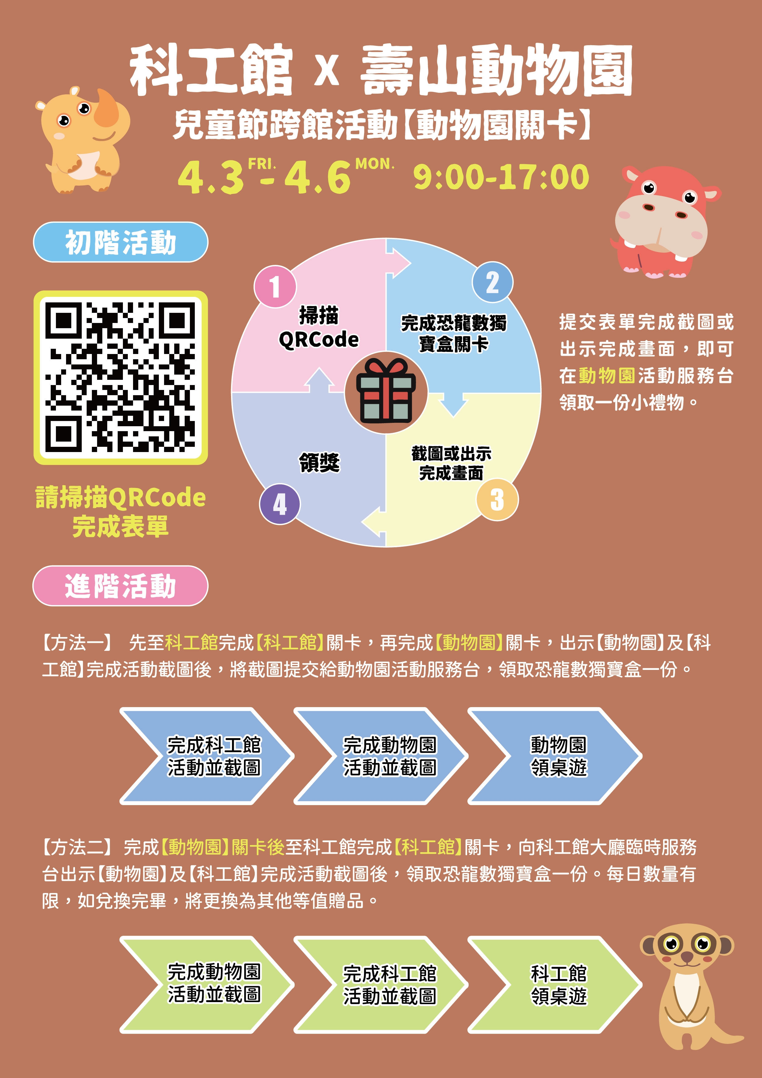 首先推薦最具話題性的「恐龍數獨寶盒」活動(1F大廳),這是由科工館聯名壽山動物園共同推出的桌遊遊戲組,參與者在B1F氣候變遷廳的櫥窗尋找關鍵答案,提交電子表單完成活動截圖或出示完成畫面,即可換取小禮物一份;活動期間完成科工館關卡及動物園跨館關卡任務,在雙館活動服務台出示完成活動截圖,即可兌換「恐龍數獨寶盒」1份,每日數量有限,兌換完畢將更換其他等值贈品。此外,在1F大廳還有「恐龍塗鴉基地」、「恐龍同樂會」、「恐龍驚喜秀」、「翻轉恐龍拍拍樂」、「恐龍閱讀樂」等活動。讓孩子們的連假行程變得更加充實且富有挑戰性