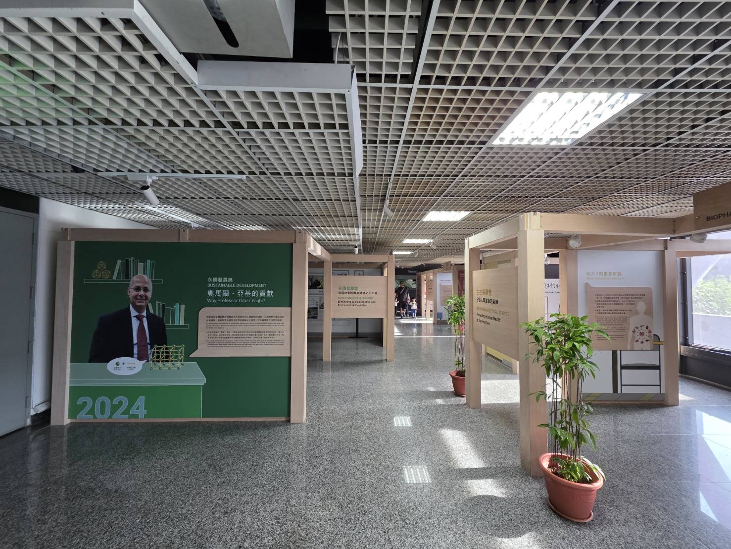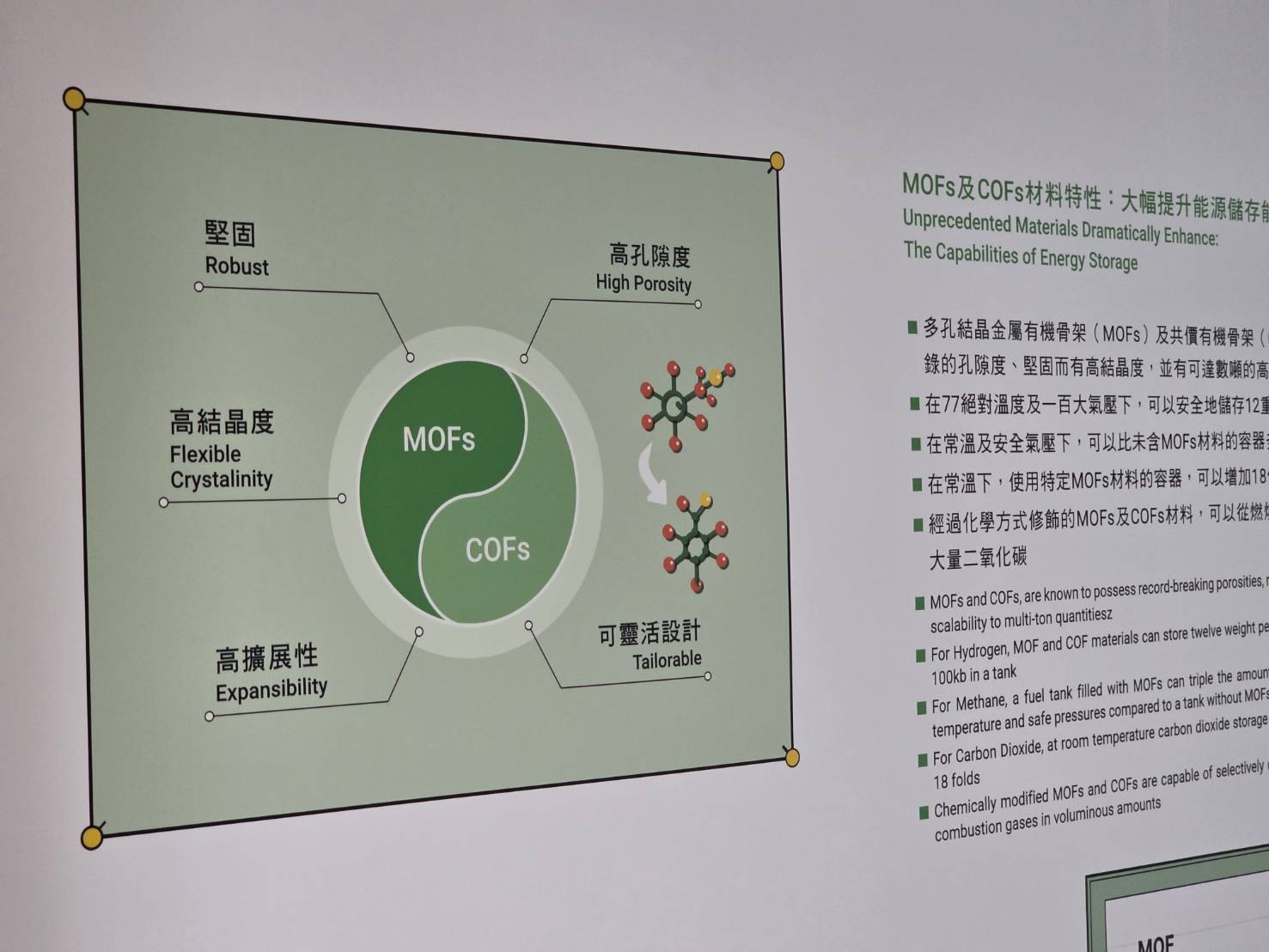 亞基(Omar M.Yaghi)教授是出生於約旦的巴勒斯坦難民後代,在約旦荒漠中目睹一家十一口仰賴政府每兩週配給自來水的經歷,其成長的歷程給予了他靈感泉源,使他立志透過科學為乾旱地區解決用水難題。亞基教授透過網格化學將有機與無機分子「像搭積木一樣」連結成具有高度孔隙的金屬有機框架(MOFs)和共價有機框架(COFs)材料。這類新穎材料擁有巨大內表面積和可客製化孔洞結構,能吸附濃縮大氣中的二氧化碳、甲烷、氫氣和水分,為能源與環境領域帶來革命性應用。在展場中,可以了解模擬MOF晶體吸附二氧化碳和甲烷的過程、以及MOF沙漠集水裝置的原理示意,圖示說明讓觀眾理解「抓住空氣中的氣體與水」的技術如何成真。