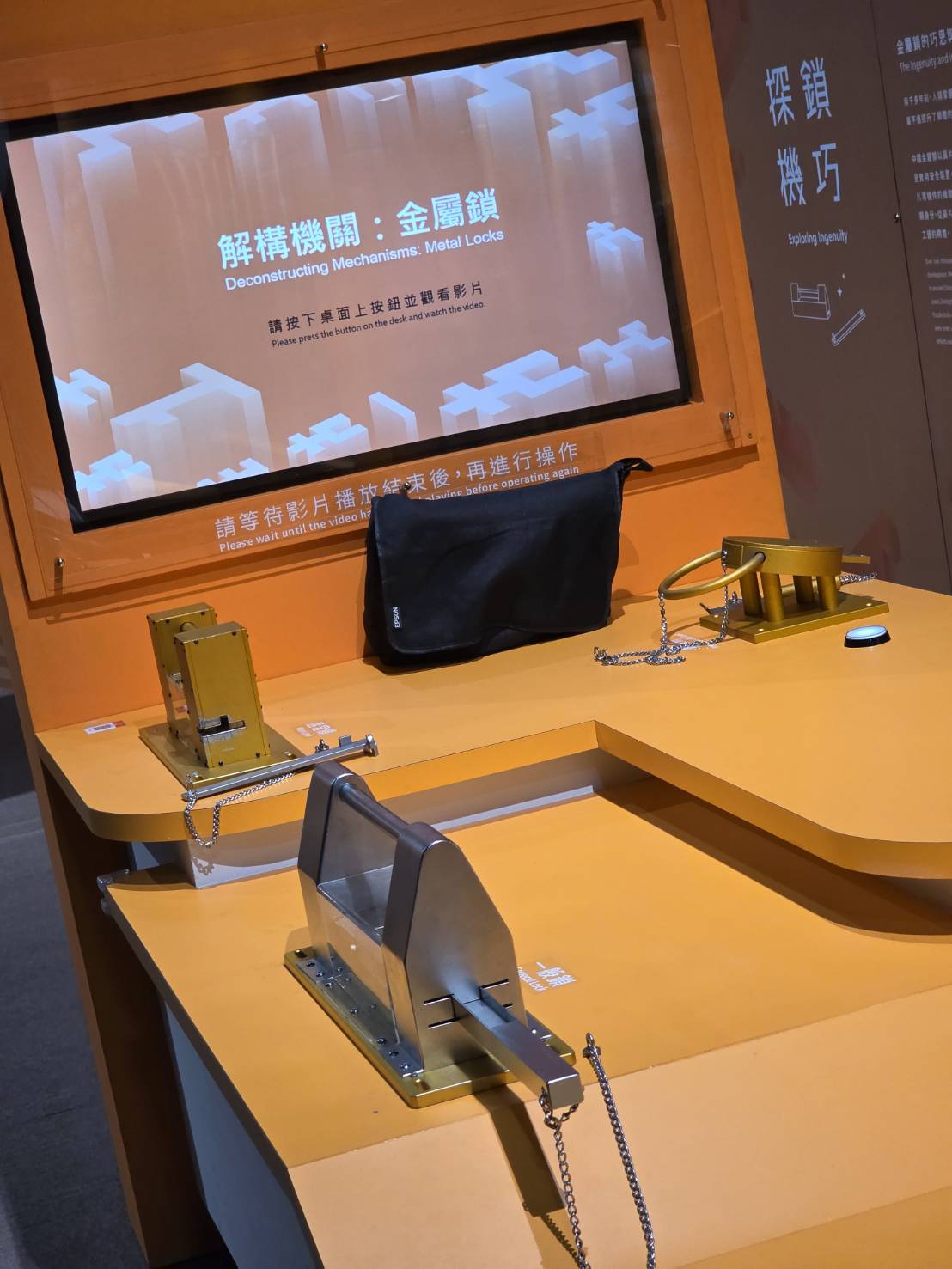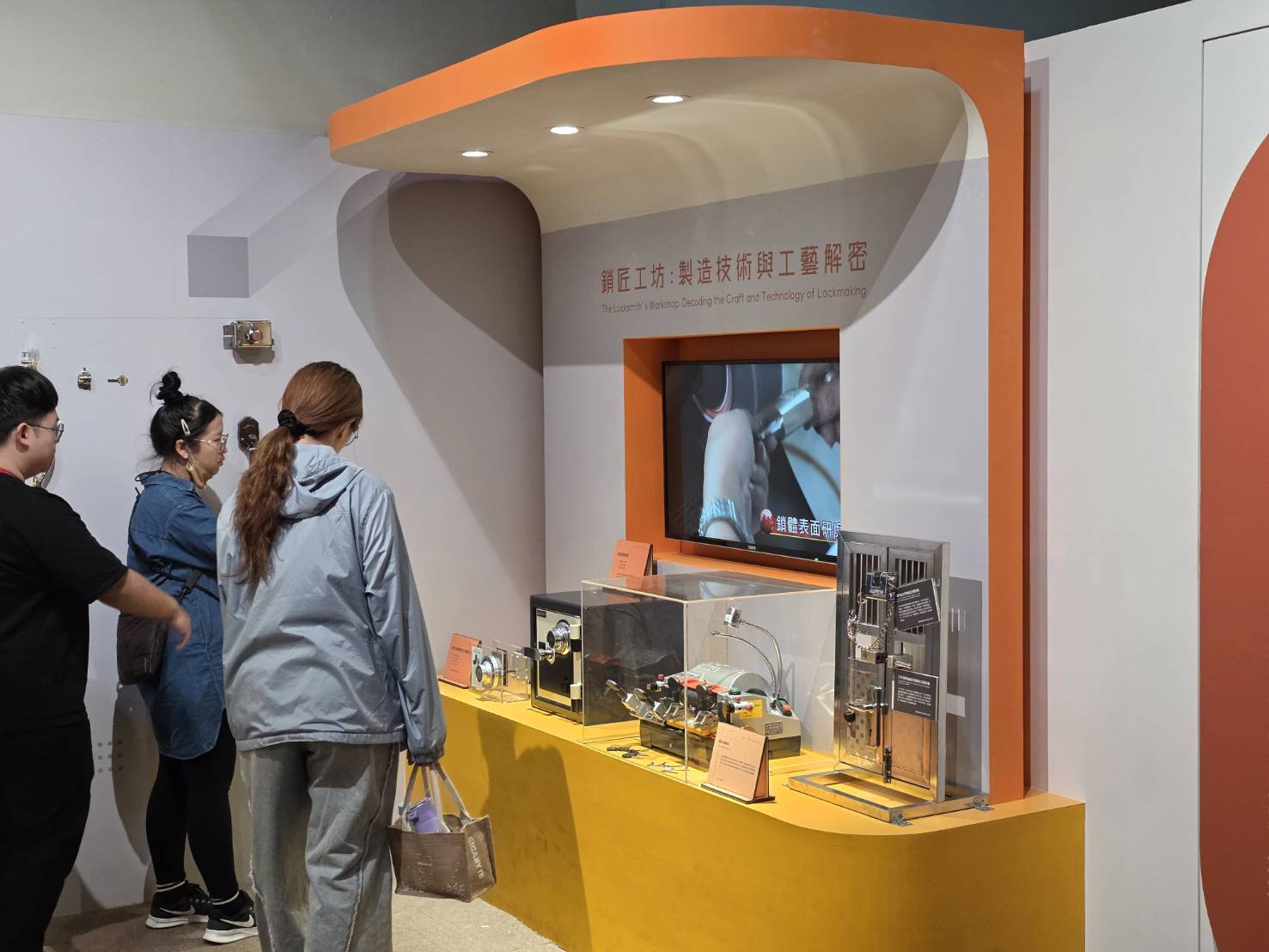 另外還有2F「動力機械廳內之鎖具專區」,則是以「Locks and Keys」為主題、「探鎖機巧與現代守門人,看見安全技術的演進」為旨趣,帶領觀眾從古早時期的早期木栓鎖,一路認識金屬鎖、簧片鎖與現代智慧門鎖的演進。「金屬鎖的巧思與互動」單元,透過剖面模型與透明外殼展示簧片鎖、木栓鎖與組合鎖的作動原理,觀眾可以實際推拉鎖栓、轉動刻有文字或數字的轉輪,觀察簧片、缺口與鎖梗如何配合,體會「對的鑰匙」為何能在對的位置解鎖。牆面上的「鎖具展示牆」則集結廣鎖、花旗鎖、魚形鎖、人形鎖與西洋鎖等各式古今造型,也點出鎖在生活中兼具實用與吉祥意涵。而「鎖匠工坊:製造技術與工藝解密」區,搭配影片與實物機具,呈現開鎖、配鎖與門鎖製造流程;一旁的「現代守門人」、「安全新世代」展台則整合指紋辨識、臉部辨識與智慧門鎖,呈現從機械結構到智慧科技的轉變,讓民眾理解安全防護不僅是硬體,更反映社會對隱私、居家安全與生活品質的期待。從古老的木鎖到現代的精巧機械鎖,每一道鎖的轉動,都是人類智慧的結晶。展區除了呈現鎖具從實用到藝術的演進歷程,更規劃了動手操作解密區,讓觀眾透過解鎖與觀察,理解鎖具中隱藏的奧秘。