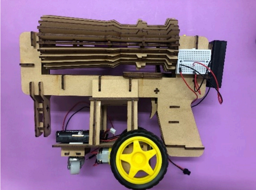 玩具科學「遙控加特林機槍自走砲車」:加特林機槍可以拿在手上作為衝鋒槍使用,也可以將電路與遙控車的遙控系統結合,一邊控制車台的移動,同時可以行進中對目標進行射擊。本課程中有遙控加特林自走砲,實兵演練,課程結束後將可將作品帶回。