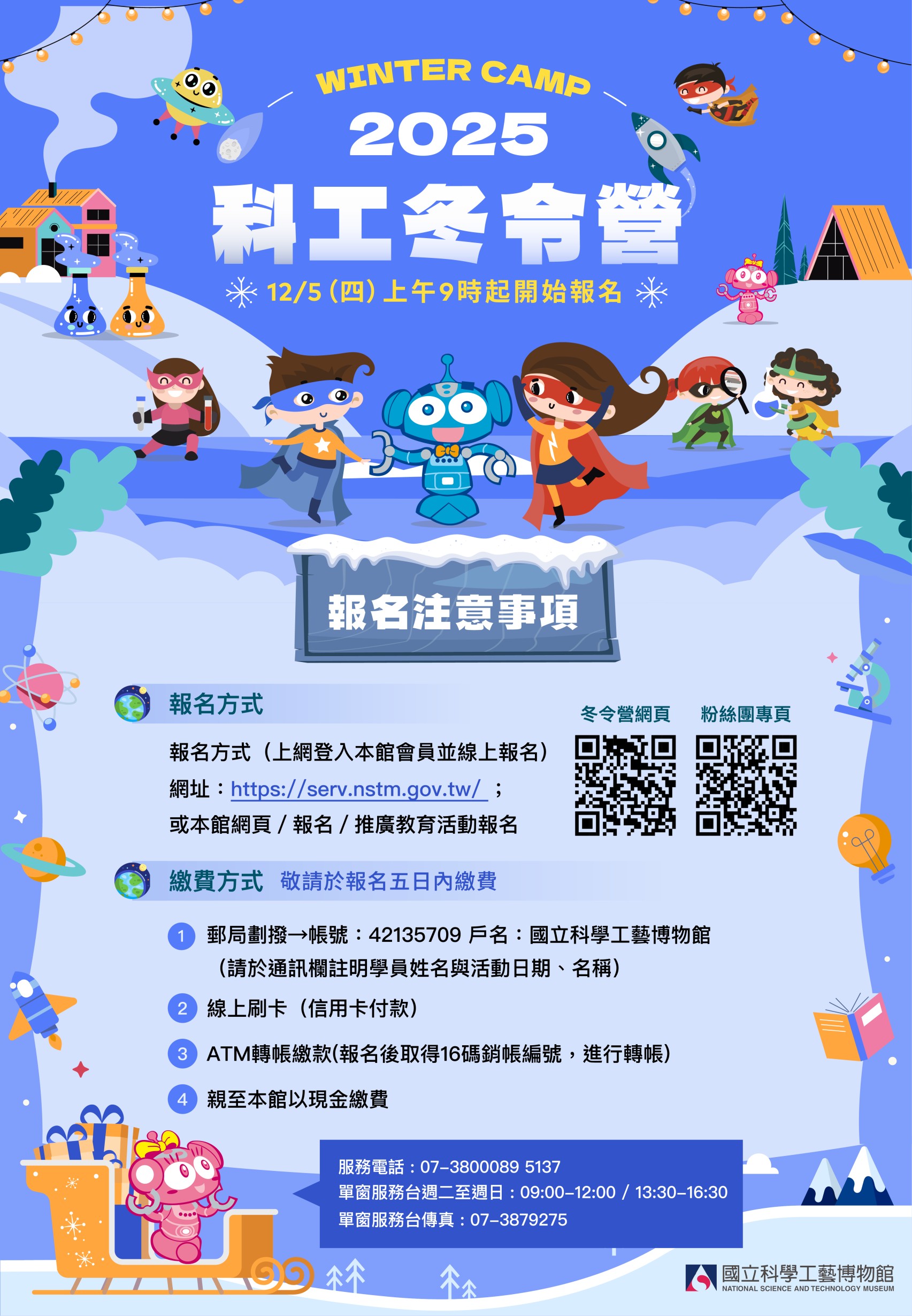 有關科工館114冬令營隊其他活動介紹,可查詢科工館官方網頁最新消息、科工FB粉絲專頁、電子報等。報名方式為上網登錄成為科工館會員並線上報名:https://serv.nstm.gov.tw/,營隊活動服務專線:07-3800089轉5137(服務時間:週二至週日 上午09:00至12:00下午13:30至16:30),課程內容服務專線07-3800089轉5193洪小姐