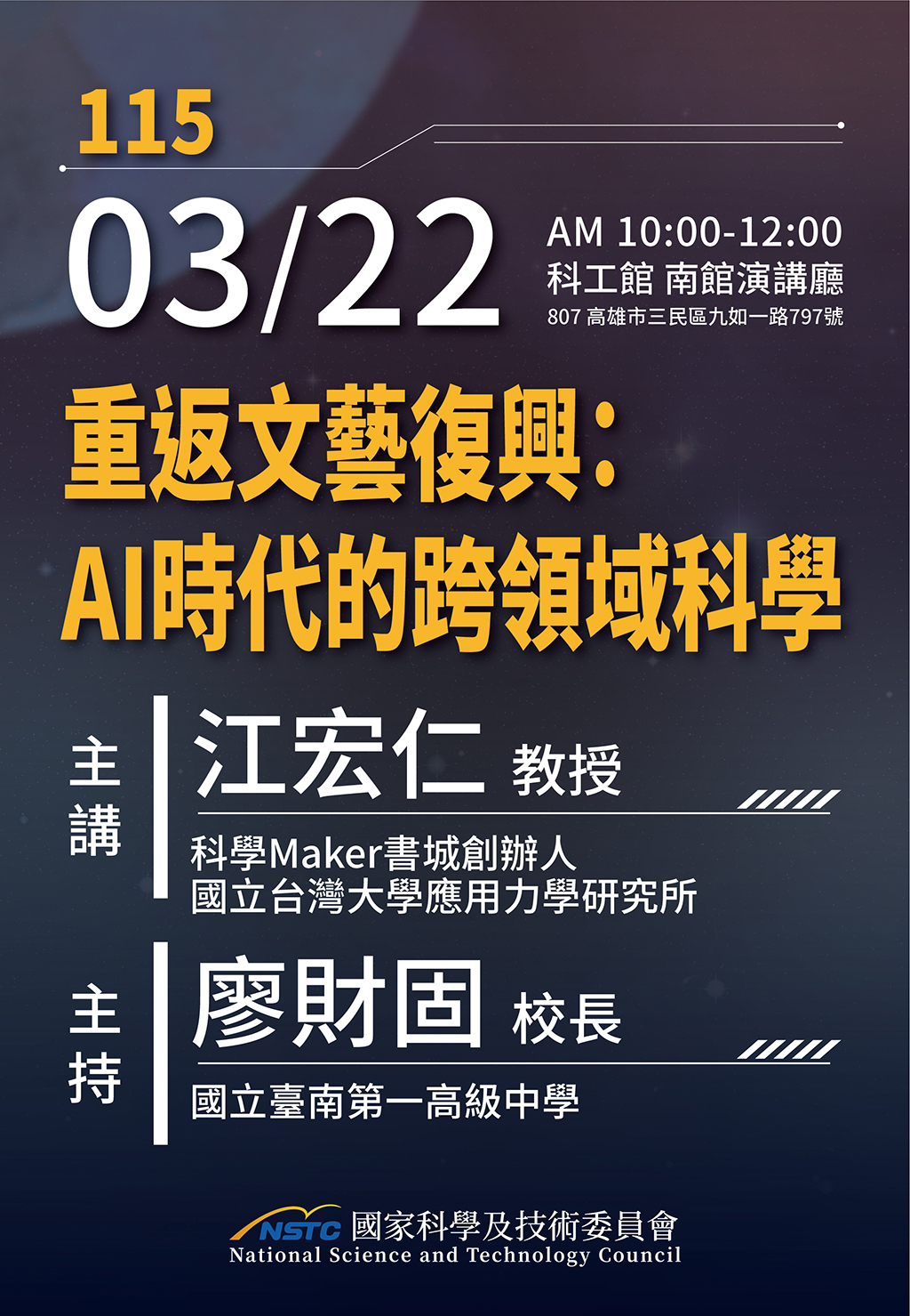 您是否曾嚮往文藝復興時期達文西那樣博學多才的境界?然而,在專業分工高度細化的現代社會,跨領域創新似乎變得遙不可及。由國科會連續補助的「週日閱讀科學大師講座」,將於115年03月22日上午10時舉行,特別邀請國立臺灣大學應用力學研究所江宏仁教授,主講「重返文藝復興:AI時代的跨領域科學」,帶領大家一同探討 AI如何成為開啟新時代博學之路的關鍵鑰匙。