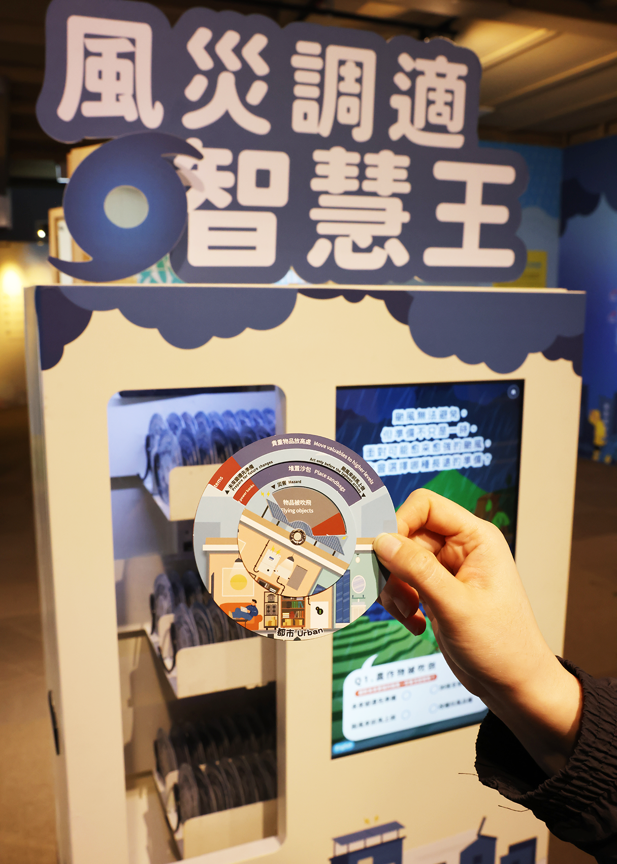身處於都市、坡地農業跟養殖魚塭,各自會遇到不同的衝擊。都市可能會面臨低樓層淹水,在日常生活中就可以把貴重物品放到高處;坡地農業可能會面臨農作物被吹倒,在挑選作物時就可以改種抗風品種;養殖魚塭可能會面臨魚塭水溢堤,需要提前改善魚塭排水系統等。科工館所推出的「風災調適智慧王」,讓民眾能思考面對颱風短期與長期分別能做好那些準備,在日常生活中進行規劃,應對可能帶來的衝擊。