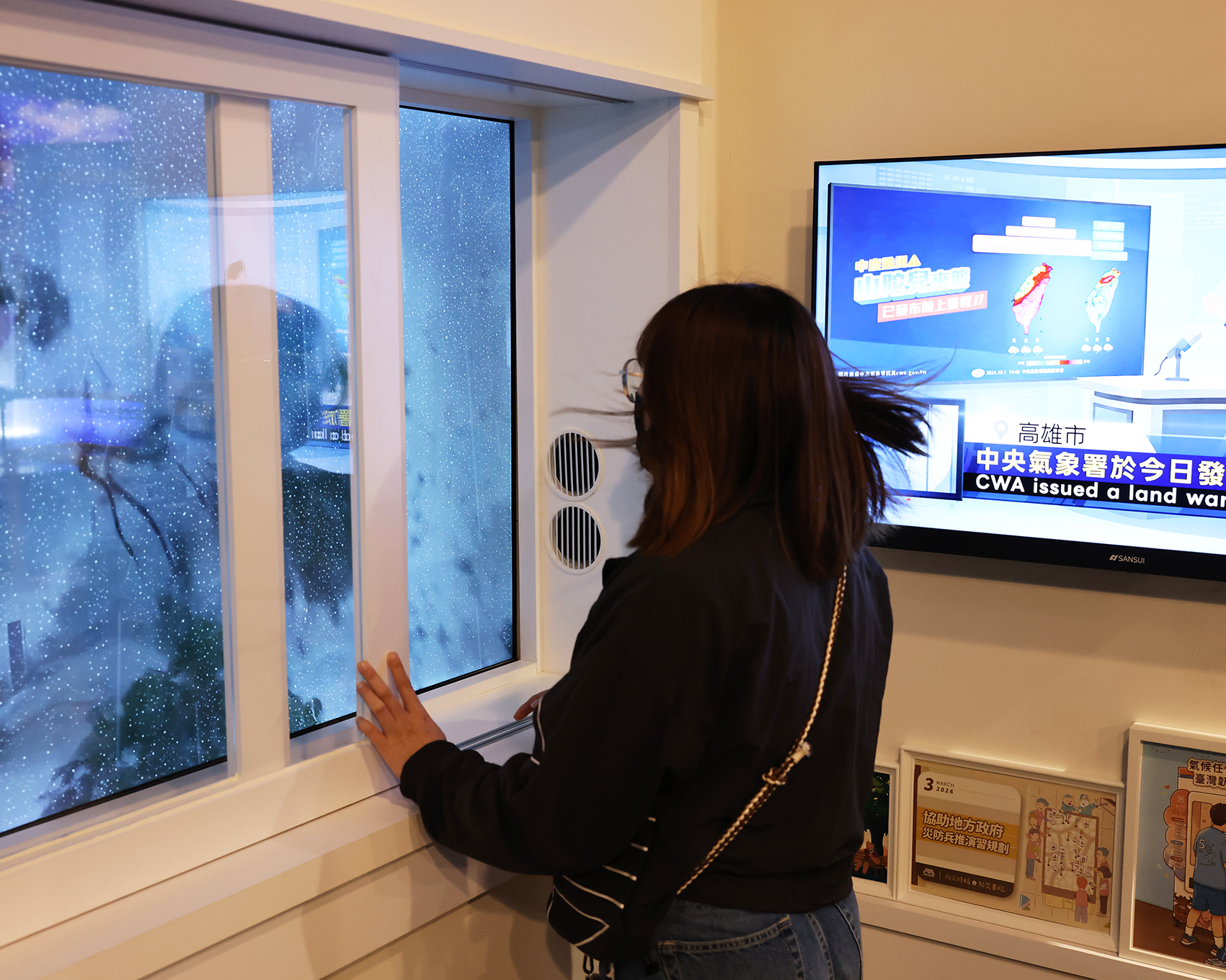 - 颱風體驗窗:根據中央氣象署提供過往的颱風數據,結合多元感官體驗,再現颱風對我們的影響颱風對同一個地點的影響,觀眾體驗並觀察颱風特性。