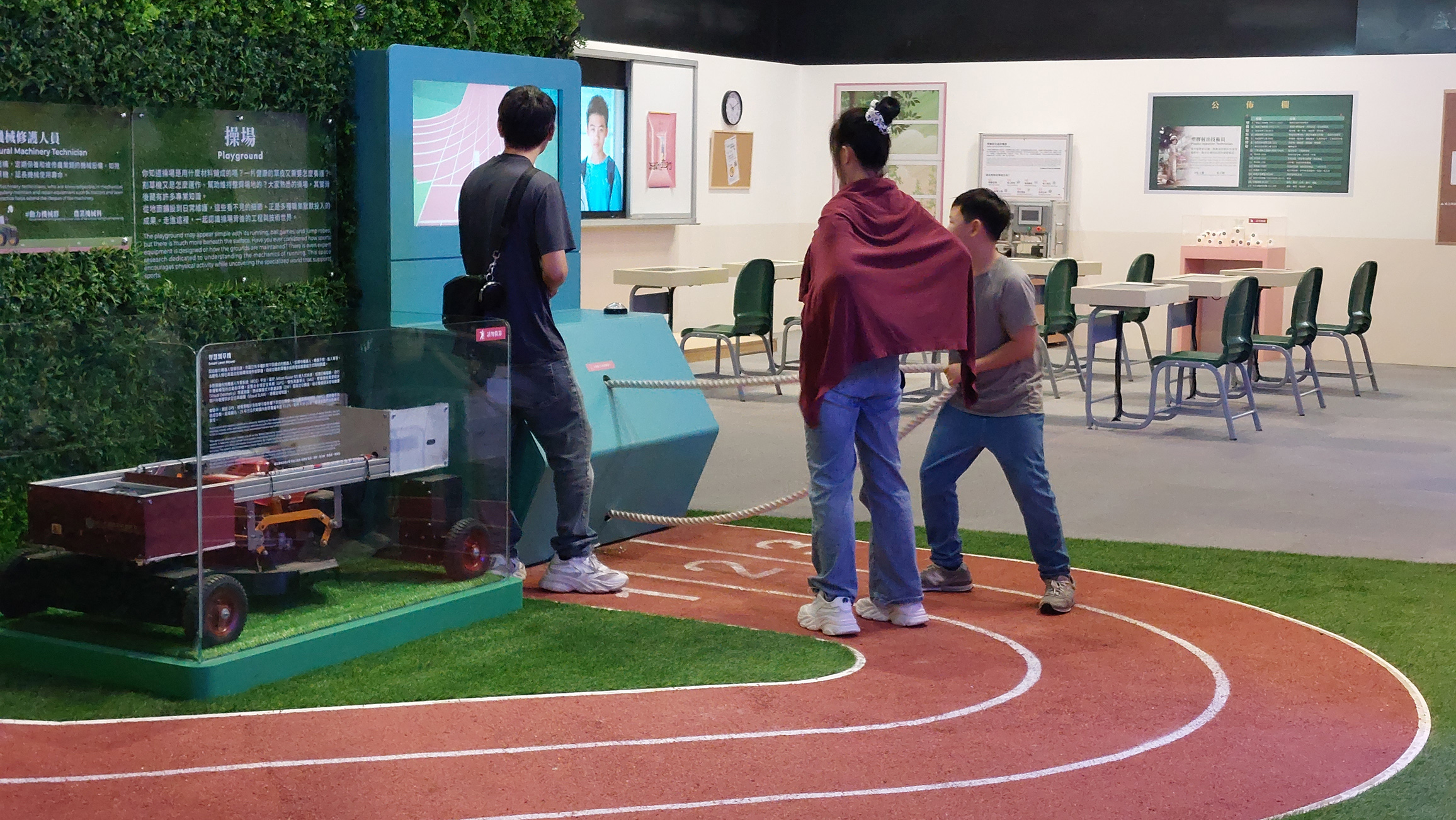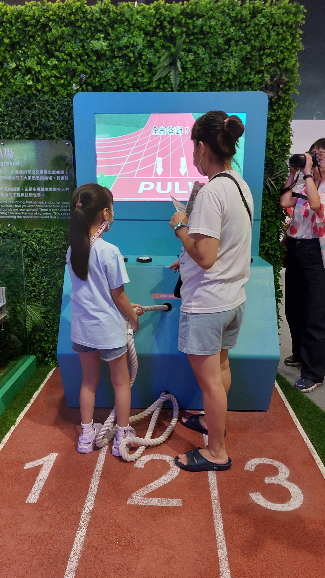 「拔河高手」透過簡單遊戲體驗PU跑道的設計;「請減速慢行」運用體感互動模擬交通現場,介紹監測工程與電子通訊職種。