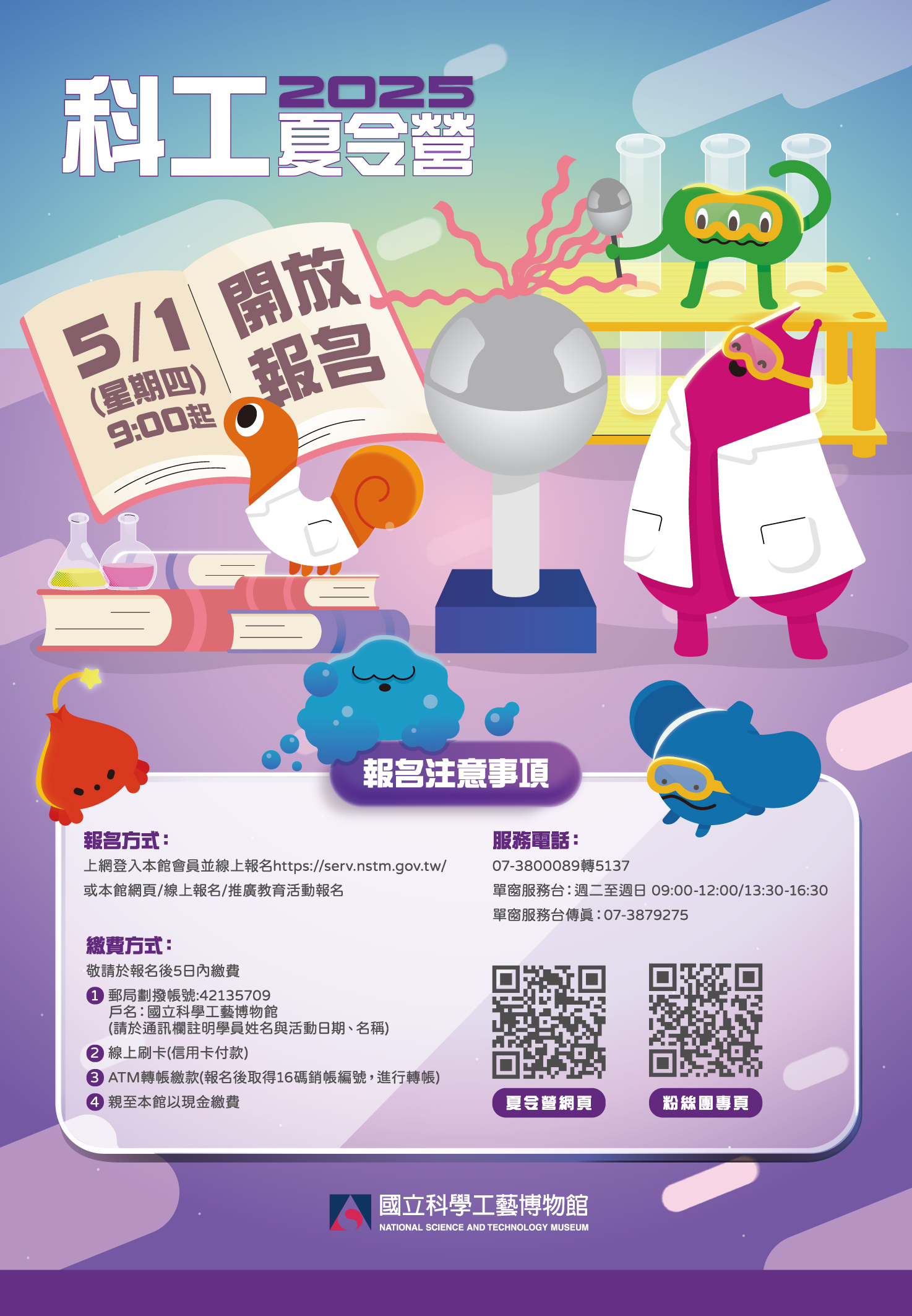 今年更特別強化戶外探索與跨學科應用的營隊設計,如結合自然觀察與科學實驗的熱門營隊、融入醫療模擬與職涯體驗的「職能試探營」,以及從Scratch到AI繪圖一應俱全的「數位應用營」等。報名資訊與詳細內容請至科工館教育活動網站https://education.nstm.gov.tw/summercamp,名額有限、額滿即止,歡迎家長盡早規劃,讓孩子在歡笑與驚奇中,度過一個難忘又充實的科學暑假!