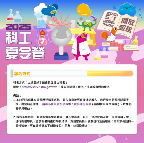 ::: 訂閱/取消訂閱︱回電子報列表︱我要轉寄 科教活動 一、大人の科學(精品洋酒-威士忌品酒課程) 品味人生,從一杯威士忌開始! 你是否曾在選購威士忌時感到困惑? 不確定該如何品味它的獨特風味? 威士忌的香氣與風味,藏著什麼樣的科學的秘密呢? 為什麼同樣的原料,經過不同的蒸餾工藝與橡木桶熟成,能創造出千變萬化的口感? 這堂威士忌品酒課,將帶你從不同角度探索威士忌,學習品飲技術,透過視覺、嗅覺、味覺分析,破解威士忌的獨特魅力! 講師:王敬皓 (英蓋爾精品洋酒專業講師) 地點:北館 B1 趣自造大教室 第二梯 5月2日 (五) - 5月3日 (六) 19:00-20:30,共2堂課 立即報名 https://www.accupass.com/event/2503120859301828336140 - - - - - - - - - - - - - - - - - - - - - - - - - - - - - - - - - - 二、科工夏令營2025年5月1日上午9點開放報名 科工陪你FUN暑假 7月1日起至8月31日止,假日延長營運至下午6時 南下旅遊千萬不要錯過! 爹娘救星 ~ 科工夏令營 5月1日開放報名 https://education.nstm.gov.tw/summercamp/ 國外營隊︱館外活動︱雙語營 生活科學︱職能試探 生物世界︱天文與太空 軟體應用︱程式與機器人 玩具科學︱動力機械 物理化學︱數學 幼兒科學︱創意積木 - - - - - - - - - - - - - - - - - - - - - - - - - - - - - - - - - - 三、職能試探系列新開班! 科工夏令營 有任何報名的疑難雜症看這裡~~ 我想電話洽詢 (07) 380-0089 轉 5137 科教服務台 網紅養成記︱科學小廚師 AI醫學人文︱生成AI工程師 小小中醫師︱實驗化學師 小小科學家︱小小理財營 ------------------------------- 更多 科工夏令營 課程搶先看! https://education.nstm.gov.tw/summercamp/ 檔案下載 大人の科學(精品洋酒-威士忌品酒課程) 職能試探系列新開班! 科工陪你FUN 暑假 科教活動