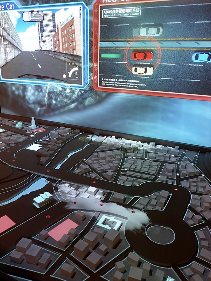 交通夢想廳「智慧駕車遊高屏」展示單元,建置一套共2部小客車模擬駕駛裝置,可以體驗在還沒有發展到全自動駕駛階段之前,目前已逐步成熟的智慧運輸系統(ITS),它將如何幫助駕駛安全又有效率的從高雄開車到潮州?沿途中會遇到行人、輕軌經過、交通事故、天候不佳等路況,甚至突然從路旁竄出的其他車輛,就別提前方的紅綠燈等交通號誌,智慧運輸系統都會事先告知或及時提醒,幫助駕駛平安地抵達目的地。