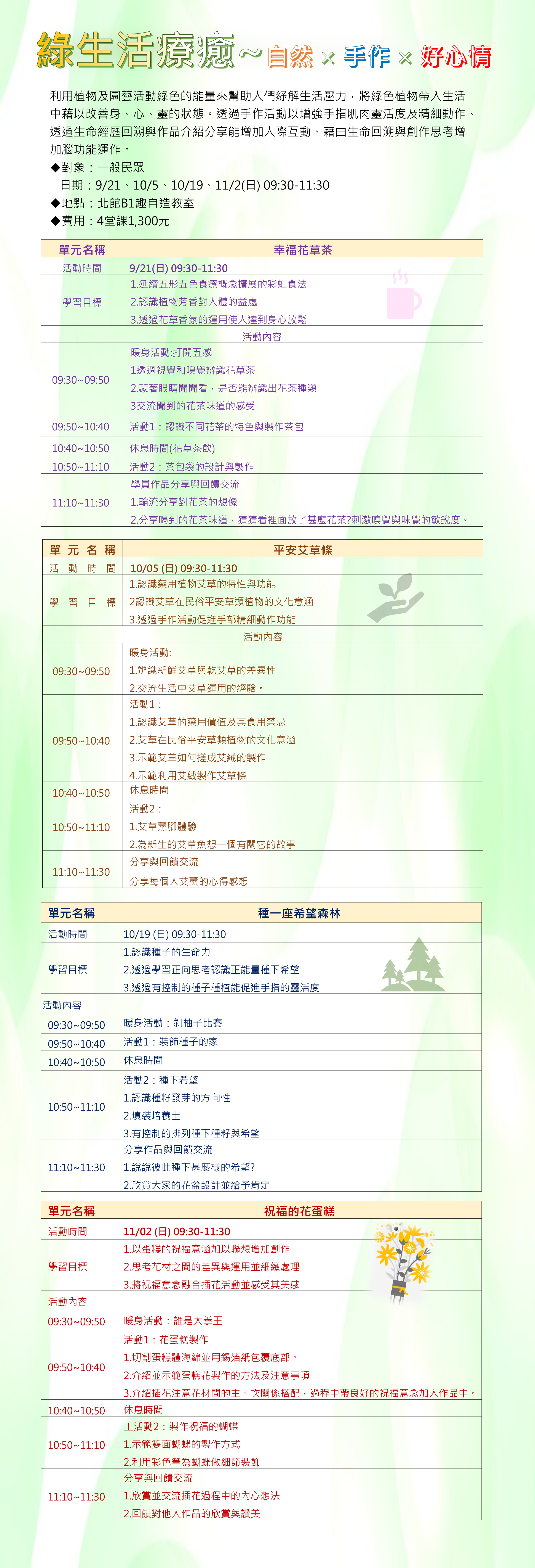 ::: 訂閱/取消訂閱︱回電子報列表︱我要轉寄 科教活動 一、與博物館對談-未來防災專題探索 走進博物館,交換我們與災害的故事 每一場災害之後 都藏著一段等待被聽見的生命經驗 邀請您走進「希望.未來-莫拉克風災紀念廳」 在展覽中與彼此對話 找回記憶、理解災害,也想像未來 日期:即日起至114年12月27日 (六) 時間:每週六 15:00-16:00 請事先報名,報名連結 https://reurl.cc/Rk0Zk9 地點:科工館 北館 6F 希望.未來-莫拉克風災紀念廳 - - - - - - - - - - - - - - - - - - - - - - - - - - - - - - - - - - 二、趣自造-鋼琴音樂盒 學習重點: 鋼片長短改變音高;共鳴箱可以擴大聲音 教學特色及內容:中世紀歐洲鐘樓為了報時能夠有悅耳的聲音,於是音樂和就此誕生了。 利用齒輪、鋼片的機械結構自動演奏音樂,加上鋼琴造型的共鳴箱,讓悅耳音樂陪伴入夢鄉。 ※作品可攜回 活動日期:114年9月27日 (六) 09:30-12:30 活動對象:小一至小六 活動地點:北館趣自造中型教室 報名網址:https://serv.nstm.gov.tw/act_query - - - - - - - - - - - - - - - - - - - - - - - - - - - - - - - - - - 三、大人科學 綠生活療癒系列~自然 × 手作 × 好心情 將「綠色能量」融入日常,讓植物與園藝活動成為舒緩壓力、調整身心靈的療癒力量。您將體驗: ●植栽陪伴 把綠意帶進生活,改善身心狀態,感受自然的療癒。 ●療癒手作 透過創作練習,增強手部靈活度與精細動作。 ●互動分享 藉由作品介紹與生命故事交流,建立溫暖的人際連結。 ●心靈激盪 在回溯與創作思考中,活化腦力,激發更多靈感。 讓我們一起加入「綠生活療癒系列」四堂療癒課程,在自然中釋放疲憊,找到生活中的平靜與能量吧! 上課日期 114年10月5日 (日)平安艾草條 114年10月19日 (日) 種一座希望森林 114年11月02日 (日) 祝福的花蛋糕 時間:09:30 - 11:30 地點:北館 B1 趣自造教室 費用:1,300元 報名:https://serv.nstm.gov.tw/act_group 搜尋【大人科學系列】 檔案下載 與博物館對談-未來防災專題探索 趣自造-鋼琴音樂盒 大人科學 綠生活療癒系列~自然 × 手作 × 好心情 科教活動