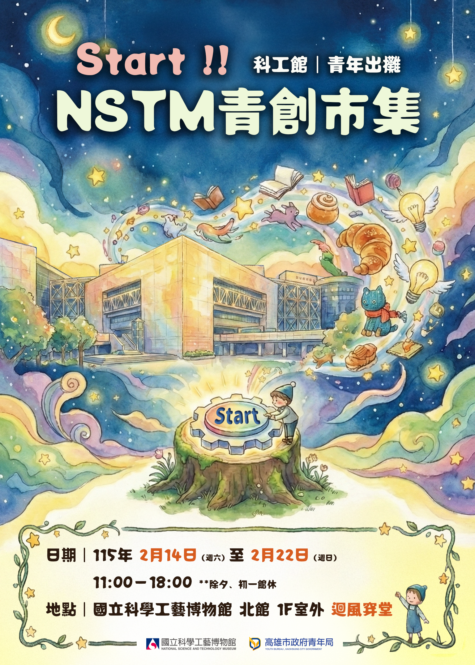::: 訂閱/取消訂閱︱回電子報列表︱我要轉寄 熱點行銷 一、115年春節期間營業時間延長至下午6時 (除夕、初一休館) 為讓外縣市遊客有更彈性的休憩時間安排,科工館在115年春節期間, 2/14 - 2/22 開館時間延長為 上午9時至下午6時, 除夕、初一 兩日休館,歡迎您的闔家光臨! 洽詢專線 : (07)380-0089 轉分機8100 ※16時20分後體驗設施、電影院、開放式典藏庫未開放 ---------------------------------------------------- 二、科工館 x 季洋咖啡minibar三民永年吧-消費滿百元,現金享9折優惠 1. 觀眾持本館票根 或 2. 手機出示本館會員頁面 消費滿百元,現金享9折優惠 季洋咖啡minibar三民永年吧 菜單參考 ▸https://reurl.cc/5Kny1v 地址:高雄市三民區永年街72號 電話:0906-146999 活動自即日起至115年12月31日止 ---------------------------------------------------- 三、農曆春節期間於北館一樓戶外迴風穿堂辦理「Start!NSTM青創市集」 科工館 x 高市府青年局 Start!NSTM 青創市集 寒假新春登場!出攤倒數中!! 日期|2026. 2/14 - 2/22 11:00-18:00 **2/16 除夕、2/17 初一館休 地點|北館 1F 迴風穿堂 高雄市三民區九如一路720號 買杯 My bae|灣味復古飲品 打造復刻經典飲品,用有溫度的飲料陪伴大家。 虎抱兔食坊|麻油米糕 虎抱兔,代代富!料理兼具熱情與細膩,邀您一起品味富足。 菁夯|港式雞蛋仔 外酥內Q,現烤風味絕佳,素食者也能安心享用。 我覺得可以|氣泡飲 果汁堅持只用「真水果」現打,讓大人小孩喝得安心又開心! 焼き焼きYAKI|仙人掌雞蛋糕 簡簡單單,原料安心無負擔,希望你也喜歡。 HITHERE|南非國寶茶 一杯茶,一種態度,讓自在、從容、優雅成為你生活的一部分。 主辦|國立科學工藝博物館 協辦|高雄市政府青年局 洽詢電話 (07) 3800-089 #6704 公共服務組 莊小姐 ---------------------------------------------------- 四、豬・鼠・牛・虎 小朋友集合囉!彩虹童畫,生肖小寶貝限定優惠 彩虹童畫|生肖小寶貝限定優惠 把拔馬麻這個一定要存起來! 一大一小入園只要 280 元(原價 480 元,現省 200 元) 詳情 https://pse.is/8lnvrm 家裡有 12 歲以下、屬豬/鼠/牛/虎 的小寶貝嗎? 只要帶著健保卡、寶寶手冊等身分證明 就能一起來 彩虹童畫親子樂園 玩,並享有超值優惠 ! 活動期間:即日起至2026/2/28 檔案下載 季洋咖啡minibar三民永年吧 青創市集 彩虹童畫 生肖小寶貝限定優惠 熱點行銷