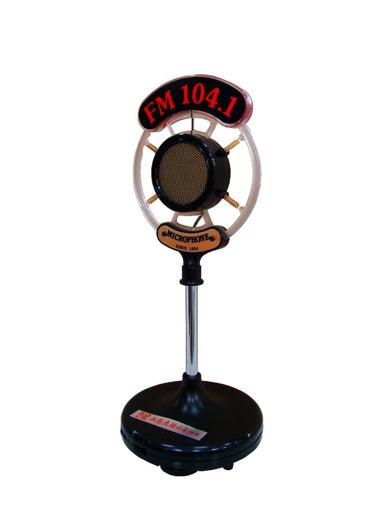 1994年正聲臺北調頻台創立,以生活資訊為頻道定位,全天節目配合時間特性及聽眾需求。這件廣播播音室麥克風造型的收音機,是正聲台北生活資訊調頻台開台紀念贈品,造型相當討喜且具有時代意義,麥克風上方有正聲台北生活資訊調頻台頻道「FM 104.1」,標誌臺灣廣播事業的一頁發展。