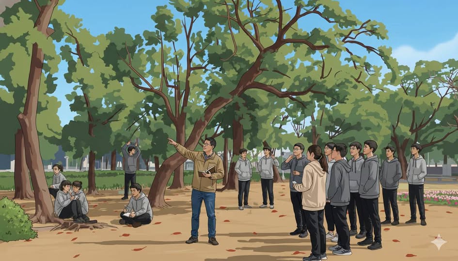 沿著林蔭小徑前行,跟著老師的腳步,