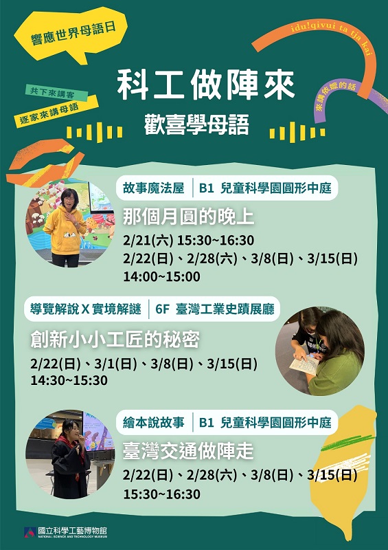::: 訂閱/取消訂閱︱回電子報列表︱我要轉寄 科教活動 一、科工chill嗨嗨-「零背景都懂!科學怎麼被看見」 還記得,你是什麼時候對科學產生好奇的嗎? 本集我們邀請到#國家實驗研究院-媒體事務聯絡人的李名揚老師 分享他是如何以#理科生背景 踏進#科學傳播的第一線 而在他豐富的記者經歷中 曾遇過哪些個性滿點的#科學家? 又曾聽過哪些因為科學知識不足而鬧出笑話的報導呢? 快讓老師帶著我們一起喜歡上科學 或至少,不再害怕它! 本集來賓: 國家實驗研究院 媒體事務聯絡人 李名揚 老師 本集重點: > 物理背景適合走科普傳播? > 和科學家溝通時的小眉角 > 科學底子會影響報導內容? > 科學新聞不被重視的原因? > 動手體驗科學的成就感 科工chill嗨嗨 Podcast >Apple:https://pse.is/5242gn <https://pse.is/5242gn> >SoundOn:https://pse.is/52czs4 <https://pse.is/52czs4> >Spotify:https://pse.is/52ehx9 <https://pse.is/52ehx9> >KKBOX:https://pse.is/526v6z <https://pse.is/526v6z> 歡迎至下方連結回饋您寶貴的意見喔! https://forms.gle/28GGbFWx2tK62MvT8 <https://forms.gle/28GGbFWx2tK62MvT8> ---------------------------------------------------- 二、【世界母語日】科工做陣來‧歡喜學母語,歡迎大家做陣來𨑨迌 科工做陣來 • 歡喜學母語 ,歡迎大家做陣來,歡迎大家做陣來𨑨迌! 為響應「 世界母語日 」並營造國家語言友善環境,本館特於 115年2月21日至3月15日 期間 規劃系列推廣活動。透過本土語言導覽、繪本導讀及手作體驗,將科學與文化傳承緊密結合。 活動內容摘要: 1. 故事魔法屋 以繪本《那個月圓的晚上》為主題,帶領學童探索物種共生與海洋資源永續,並安排臺灣特有種動物拼圖製作。本活動全程融入本土語言互動,深化自然環境保育意識。 地點|B1 兒童科學園 費用|100元 2. 創新小小工匠的秘密 全程以臺灣台語導覽工業史蹟展廳,結合實境解謎與闖關遊戲,讓參與者深度了解臺灣工業發展脈絡及永續發展之重要性,提升對國家語言的認同與應用。 地點|6F 臺灣工業史蹟展廳 費用|免費 3. 臺灣交通做陣走 針對3至8歲幼童設計,利用繪本導讀與交通模組操作,於母語語境中學習安全觀念,辨識道路危險區域,讓交通安全教育扎根日常生活。 地點|B1 兒童科學園 費用|免費 備註:上述活動均需購 本館常設展示廳門票 入館參與,詳細日期請參閱 推廣教育報名網頁 (https://serv.nstm.gov.tw/act_group)。 ---------------------------------------------------- 三、假日科學饗宴3-6月週末期間,推出春季班活動,歡迎報名! 活動包括~ 國小國中生專屬:「不插電機器人」、「LEGO S.P.M動力機械」、「幼兒創意創藝」、「創意積木」、「Gigo Power 科學」、「魔法屋的金幣秘密」、「程式設計」、「手作AI美感設計袋包」、「小小飼養員」、「自然科學」、「物理化學」 親子共學:「ROBOROBO-AI創意機器人(親子)系列-智慧寵物米飛及金牌拳擊手」、「雙語科學探索-小小實踐英語生活家」 雙語戶外教育:「踏溯果嶺公園放風想飛趣」、「踏溯在水一方:二峰圳伏流水」、「踏溯梅峰古道賞螢趣 」 樂而忘齡終身學習:「AI科技樂生活」 活動網址:https://reurl.cc/mkWkdY 檔案下載 零背景都懂!科學怎麼被看見 【221世界母語日】科工做陣來‧歡喜學母語,歡迎大家做陣來𨑨迌~ 假日科學饗宴春季班開始報名囉! 科教活動