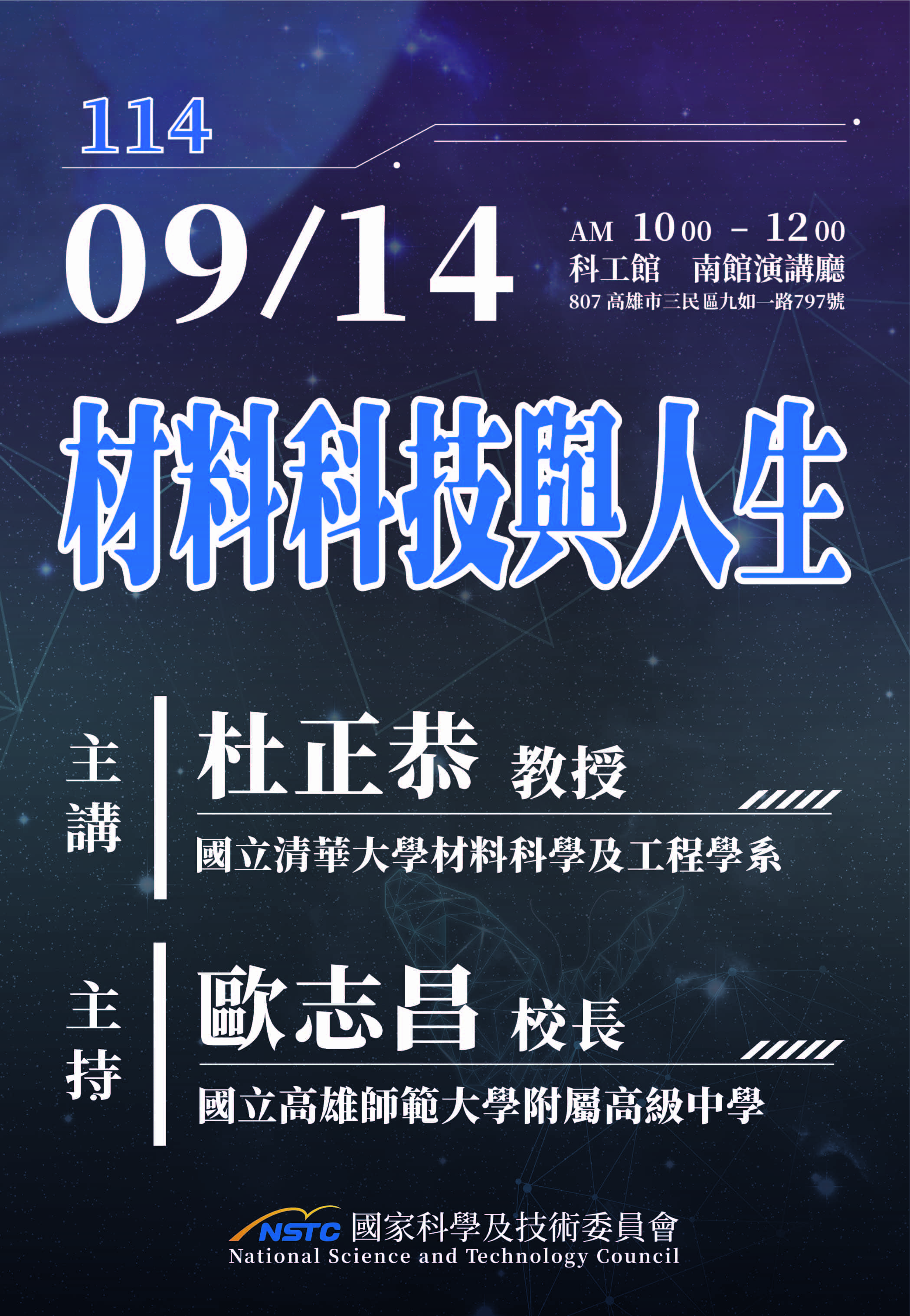 ::: 訂閱/取消訂閱︱回電子報列表︱我要轉寄 科教活動 一、科工chill嗨嗨,船說...水下有故事! 你知道嗎!在蔚藍的水底下,除了水中生物外 其實還蘊藏著許多神秘的水下文化資產! 從沉船到文物,這些歷史等待著被探索與保護 本集邀請到了-文化部文化資產局 林宏隆科長 他將帶我們一起潛入#水下世界 探索那些隱藏於水下的歷史瑰寶! 本集來賓: 文化部文化資產局 古物遺址組水下文化資產科 林宏隆 科長 本集重點: > 什麼是水下文化資產? > 要水下考古得先會潛水? > 用"銅"辨認船的由來! > 發現文物!可以帶出水嗎? > 一個壺帶你走進歷史故事 烽火船說-水下文化資產特展 首站就在科工館!帶您深入探索臺灣海戰歷史及沉船遺址 了解戰火後存留在海底的珍貴文物,踏上科技與美學的水下考古之旅! 日期:114.7.11~114.11.30(免費參觀) 地點:B1F 第五特展廳 主辦單位:文化部文化資產局、國立科學工藝博物館 科工chill嗨嗨 Podcast >Apple:https://pse.is/5242gn <https://pse.is/5242gn> >SoundOn:https://pse.is/52czs4 <https://pse.is/52czs4> >Spotify:https://pse.is/52ehx9 <https://pse.is/52ehx9> >KKBOX:https://pse.is/526v6z <https://pse.is/526v6z> 歡迎至下方連結回饋您寶貴的意見喔! https://forms.gle/28GGbFWx2tK62MvT8 - - - - - - - - - - - - - - - - - - - - - - - - - - - - - - - - - - 二、第23屆週日閱讀科學大師系列講座,第1場於9月14日開跑了! 您是否曾經思考過,若沒有青銅、鐵器、塑膠或半導體,人類文明會是什麼模樣? 材料科技不僅形塑了歷史的進程,也深刻影響著我們的日常生活與未來發展。由國科會連續補助第23屆的週日閱讀科學大師講座,將於114年09月14日上午10時 特別邀請國立清華大學材料系杜正恭教授,主講「材料科技與人生」,帶領大家一同探討材料如何成為人類文明發展的基石。 在這場講座中,講者將從歷史的脈絡出發,檢視材料與人類社會的交互作用,並剖析材料科技如何推動文明的演進。從古代工具的誕生,到現代高科技材料在日常生活的廣泛應用,無一不顯示出材料在歷史與文化中的關鍵角色。同時,講座也將深入介紹當前材料科技的核心重點與最新發展,並進一步展望未來的挑戰與契機,讓觀眾理解科技如何影響生活,以及我們又該如何以科學眼光面對未來的社會需求。聽眾不僅能夠回顧人類與材料共同走過的歷史足跡,更能從中獲得啟示,思考如何善用材料科技,為未來創造更美好的生活。 歡迎您週日攜家帶眷來科工館,一同探討材料科學的進展史和材料科學與生活的關聯。參加講座的教師或公務人員,每場核發兩小時研習進修或終身學習時數。各級學校團體(20人以上)可享團體報名優惠,上午參加講座,下午可免費進入科工館(北館展示廳)參觀。 週日閱讀科學大師 粉絲專頁、線上直播https://www.facebook.com/MeetMaster 線上演講廳 觀看歷屆講座https://demo.dracosky.net/ 地點 國立科學工藝博物館 南館演講廳(高雄市三民區九如一路797號) 連絡人及電話 國立科學工藝博物館 科教組 鄭瑞洲 組主任(07)380-0089分機5135 網址 週日閱讀科學大師網站:http://science.nchc.org.tw 國立科學工藝博物館:http://www.nstm.gov.tw/ - - - - - - - - - - - - - - - - - - - - - - - - - - - - - - - - - - 三、展廳活動 歡迎參加奇幻國-自己動手做~彩色魔法吊飾活動 歡迎大小朋友一同前來本館B1F奇幻國展廳, 本活動利用偏振片的原理,不用彩色筆也不用色鉛筆著色,而是利用偏光片和身邊隨手可得的透明膠帶,就能製作有各種美麗顏色變化的小吊飾,讓大小朋友能夠在有趣的體驗中學習科學知識,也能將自己親手做的吊飾帶回家喔! 活動日期:9月13日(六)、9月14日(日) 活動時間:上午10:00~12:00、下午 2:00~4:00(共4場) 活動地點:B1F奇幻國展廳入口 本活動免費參加(需購買本館常設展門票入館),現場報名,材料發完為止 檔案下載 科工chill嗨嗨,船說...水下有故事! 【講座】週日閱讀科學大師-材料科技與人生 【展廳活動】歡迎參加奇幻國「自己動手做~彩色魔法吊飾」活動 科教活動