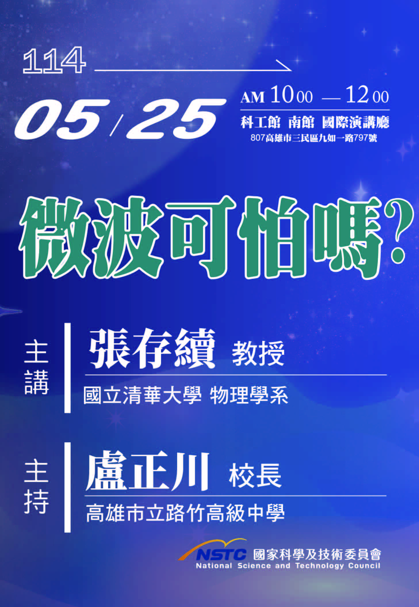 您是否曾經聽到別人說過「微波是一個很可怕的東西」,但有上過高中物理就知道,微波其實就是特定頻率間的電磁波,頻率越高能量也越高,但微波真的是我們該害怕的嗎?抑或是以訛傳訛?由國科會連續補助第22屆的週日閱讀科學大師講座,於114年05月25日上午10時,邀請國立清華大學物理系 張存續教授,主講「微波可怕嗎?」,帶領我們一起探討微波的原理及應用。