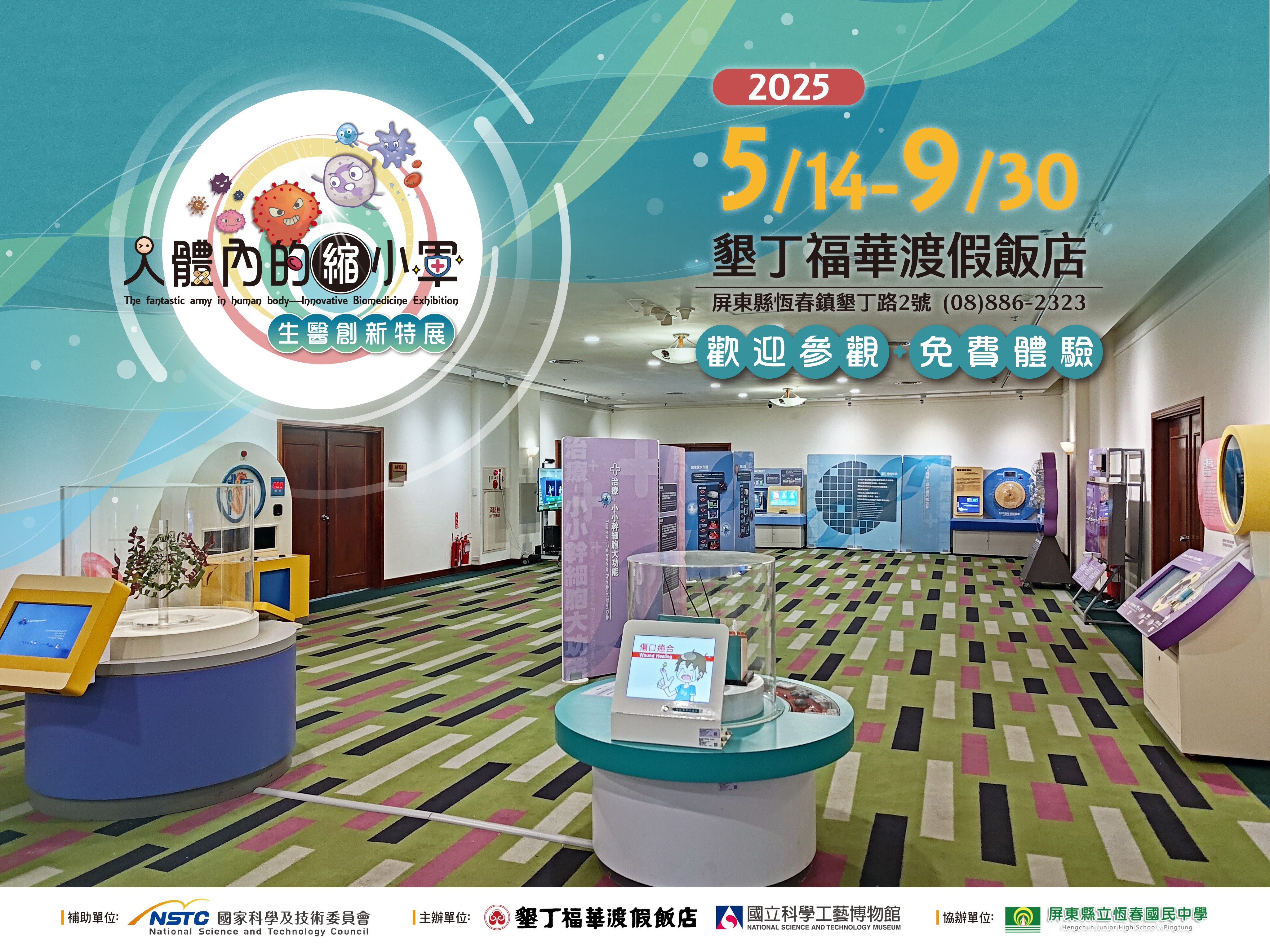::: 訂閱/取消訂閱︱回電子報列表︱我要轉寄 展覽訊息 一、熱雪天堂-兒童滑雪樂園特展,體驗滑雪圈及雪盆的刺激! 滑雪圈、溜雪盆、堆雪人,還有三層式攀爬探索區 小小孩涼夏放電首選! 展覽資訊 https://pse.is/52plwy 常溫體驗,不必加穿衣物 - - - - - - - - - - - - - - - - - - - - - - - - - - - - - - - - - - 二、特展巡迴- 人體內的縮小軍—生醫創新特展,於墾丁福華渡假飯店展出中,免費參觀,歡迎體驗! 你認識自己的身體嗎?健康的身體是我們一輩子的好旅伴。你我都曾經歷過受傷、癒合,這要仰賴在我們體內默默守護的小小軍隊們,為人體抵抗外來侵入、並幫助身體恢復健康,它們雖然微小,卻十分重要!本特展從人體第一層防護—皮膚開始,帶領觀眾進入細胞尺度的微觀世界。 本館與墾丁福華渡假飯店攜手,並透過國科會計畫補助,將人體內的縮小軍—生醫創新特展帶到恆春半島展出,今年暑假,歡迎到墾丁感受夏日風情,並學習更多關於身體的奇妙機制,揭開那些微小但極其重要的縮小軍秘密。 這場展覽以趣味風格呈現細胞與病菌大軍,讓你輕鬆進入微觀世界,發現人體系統的無窮魅力,展覽共設有近20項互動單元,邀請各年齡層觀眾參與,無論大小朋友都能享受這場充滿樂趣與學問的生醫之旅! 展覽時間:114年5月14日至9月30日 展覽地點:墾丁福華渡假飯店-屏東縣恆春鎮墾丁路2號 - - - - - - - - - - - - - - - - - - - - - - - - - - - - - - - - - - 三、特展巡迴-看不見的尺度—奈米特展,於慈濟宜蘭園區靜思堂展出中,邀您一探奈米世界的無限可能。 「奈米」與公尺、公分皆為長度的單位,1奈米等於10億分之1公尺,若把地球的直徑當作1公尺,那麼地球上一顆彈珠的直徑大約為1奈米。這種非常非常小的尺度,肉眼雖看不見,但它在現今科技中的應用不容小覷。 看不見的尺度—奈米特展透過豐富有趣的互動單元,將此看不見的尺度呈現在大家眼前。本館與慈濟慈善事業基金會攜手,把精彩的奈米特展帶進宜蘭園區靜思堂,在展區內,可以發現自然界中神奇的奈米現象,並親自觀察、體驗材料變小後所產生的變化;了解人類是如何利用奈米科技改善生活。 奈米特展邀請觀眾一同探索奈米科技的神祕世界! 展覽時間:114年5月4日至9月15日 展覽地點:慈濟宜蘭園區靜思堂-宜蘭縣宜蘭市泰山路5號 檔案下載 熱雪天堂 人體內的縮小軍—生醫創新特展 「看不見的尺度—奈米特展」慈濟宜蘭園區靜思堂展出中 展覽訊息
