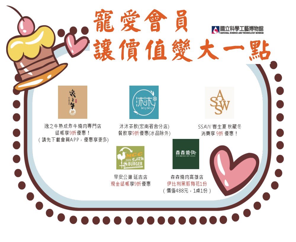 ::: 訂閱/取消訂閱︱回電子報列表︱我要轉寄 熱點行銷 一、國立科學工藝博物館邀你一起寵愛會員,把價值變大一點 科工館 #會員 專屬寵愛優惠來啦! 只要出示會員身份,就能享受超多精選店家的專屬優惠! 趕快收藏這篇,吃喝玩樂都不錯過 早安公雞 延吉店 現金結帳 享9折優惠,早午餐美味又省錢! SSAW 春生夏 秋藏冬 四季好食,天天有折!消費 享9折優惠 沐沐茶飲 宏南宿舍分店 喝杯療癒手搖,餐飲享9折優惠(冰品除外) 逸之牛 熟成炸牛燒肉專門店 吃牛也能省!結帳即 享9折優惠 森森燒肉 高雄店 會員限定送好肉!「伊比利黑豚梅花一份」(價值 $488) 每桌限一份,誠意滿滿! 記得先加入「科工館會員」,還有更多會員專屬優惠等你發掘! https://mobile.nstm.gov.tw/ 活動至114年12月31日止。 - - - - - - - - - - - - - - - - - - - - - - - - - - - - - - - - - - 二、科工館 x OD咖啡,現金享9折優惠 1. 觀眾持本館票根 或 2. 手機出示本館會員頁面 在Facebook按讚分享商家資訊,可享付現金9折優惠。 店家並講究的提供右手杯及左手杯,內用時可以選用。 OD咖啡 客製化新鮮烘焙咖啡/咖啡/咖啡豆/咖啡生豆 咖啡器具、黑豆茶批發、零售 地址:高雄市三民區懷安街137號 電話:0932-339 917 品項與網址:https://www.facebook.com/OD.Coffee/ - - - - - - - - - - - - - - - - - - - - - - - - - - - - - - - - - - 三、場地租借 即刻預約! (07)3800089 #6703 週二至週日 09:00-12:00 / 13:30-16:30 戶外場地租借 https://pse.is/5rd2rf 室內場地租借 https://pse.is/5rd2sb 線上場地導覽 https://pse.is/5rd2tm 線上場地預約 https://pse.is/5rd2vr 檔案下載 國立科學工藝博物館邀你一起寵愛會員把價值變大一點 OD咖啡 場地租借 即刻預約! 熱點行銷