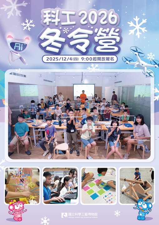 ::: 訂閱/取消訂閱︱回電子報列表︱我要轉寄 科教活動 一、臺灣農業的故事展示廳「循稻再生」(完成問卷贈送小禮物,送完為止) 《循稻再生》特展以台灣農業文化為出發點,帶領觀眾回顧稻草從「農事廢棄物」到「文化與永續資源」的轉變歷程。展覽聚焦於草鞋工藝,呈現打草、搓草、編織鞋面的完整工序,體現農村勤儉智慧與生活美學。現場展出汪銘峯博士以傳統工法結合現代設計的創新草鞋作品,展現稻草材質的多樣可能;同時亦呈現其國畫《鹿港擔埔社》,以藝術視角重現草屯「草鞋墩」古道的人文風貌。展覽不僅回顧草鞋在農村生活、交通與信仰儀式中的角色,更展望其在地方創生、文創設計與環保永續中的新價值。透過工藝與藝術的交織,「循稻再生」傳達了稻草從農業副產物到文化象徵的再生旅程,並邀請觀者思考自然、文化與未來生活之間的永續連結。 策展團隊 策展人:汪銘峯 博士 共同策展人:劉力維 博士 策展團隊:林昕慧、陳姿吟 展覽設計與規劃:國立屏東科技大學木材科學與設計系 產品設計與創新研發研究室 × 國立科學工藝博物館 展覽資訊 地點:本館 B3F臺灣農業的故事展示廳 入口特展區 開放時間:科工館開館時間 展覽期間,凡參觀後完成問卷填寫,即可獲得展廳限定小禮物一份(數量有限,送完為止)。 - - - - - - - - - - - - - - - - - - - - - - - - - - - - - - - - - - 二、115年冬令營職探系列課程 透過課程了解自已及職場環境,推出各職探系列活動「網紅營」、「中醫營」、「理財營」、「醫學人文營」、「生成AI工程師營」,以國小三年級至國一生,找到適合自已的職業道路並實現目標。 「網紅營」-認識不同鏡頭語言、剪輯技巧、燈法跟特效製作,產出屬於個人作品。 「中醫營」-透過中醫生活化活動,並藉由中醫繪本跟桌遊,在遊戲中加深對中醫印象,將融入日常生活中。 「理財營」-從做中學、玩中學中學儲蓄、消費、複利、折扣、景氣等知識概含,並培養金融素養。 「醫學人文營」-醫學、人文跨領域STEAM課程,透過探究式素養導向教學,並以實作DNA模型,教導人類遺傳密碼。 「生成AI工程師營」-預先了解人工智慧、機器學習等的差異,透過課程體驗明白大數據、演算法、影像辨識等專業。 更多冬令營活動內容,請上報名網頁查詢!! https://serv.nstm.gov.tw/act_group - - - - - - - - - - - - - - - - - - - - - - - - - - - - - - - - - - 三、布!一樣的創意苔球體驗! 內容:1.重新認識舊衣回收(30分鐘) 2.植物生長要素及挑選重點(30分鐘) 3.手作 DIY 體驗(30分鐘) 時間:12/27(週六)11:00-12:30 12/28(週日) 11:00-12:30 地點:4F 衣技織長 展示廳 對象:一般民眾 名額:每場次限 20 名 費用:200 元(需購常設展示廳門票入館) 立刻報名:https://serv.nstm.gov.tw/act_query 關鍵字搜尋【布一樣】 洽詢專線 (07) 3800089 分機 8660,洪小姐。 (週二至週五,09:30-12:30、13:30-17:00) 檔案下載 臺灣農業的故事展示廳 2026 科工冬令營 【布】一樣的創意苔球體驗! 科教活動