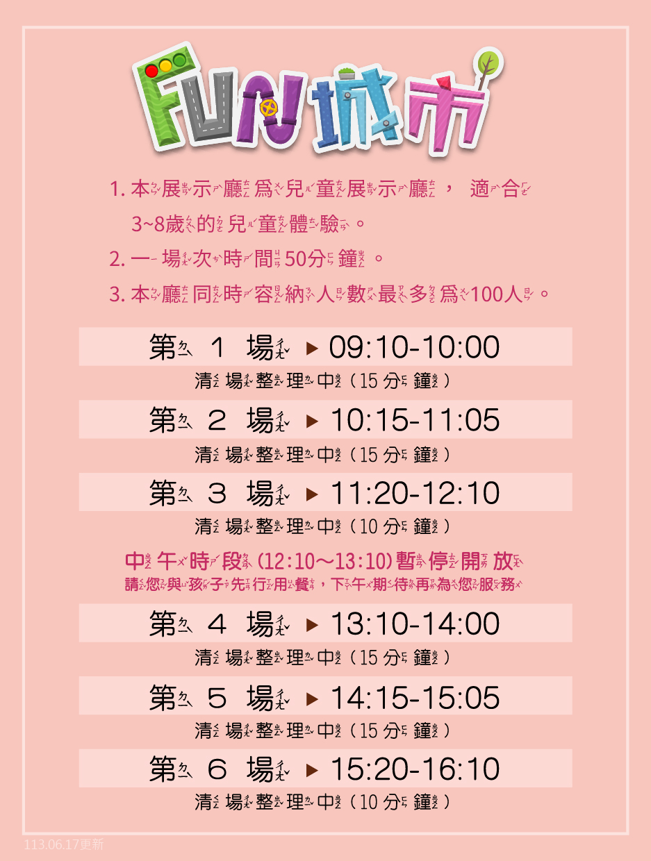 本展廳適合3~8歲兒童參觀、遊玩,每一個場次的參觀時間為50分鐘,同時最多可容納100人,詳細場次時間可參考Fun城市場次公告。