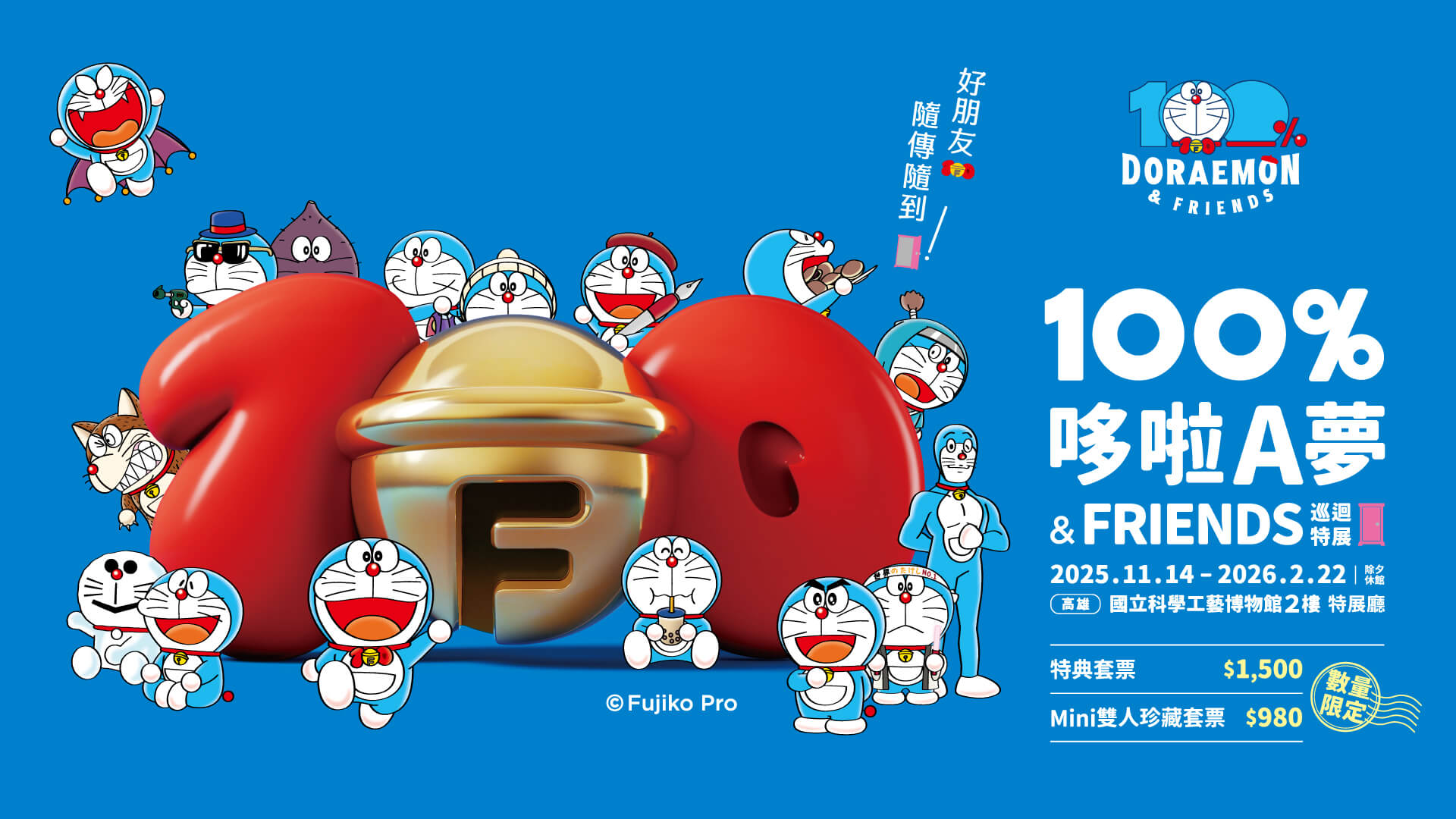 深受大小朋友喜愛的哆啦A夢與他的好友們再次齊聚於高雄,這次更帶著特別祕密道具─「100%朋友召喚鈴」,邀請各位朋友們一同玩樂,現場將展出眾多造型立體雕塑、複製原畫手稿以及多種沉浸式場景,還將重現藤子・F・不二雄老師的復刻工作室,以及各種充滿無限想像力的神奇道具,帶領大家與哆啦A夢共同創造美好回憶。