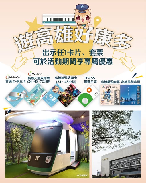 114年7月1日~115年12月31日活動期間,觀眾憑高雄捷運 所發行之套票;如:24、48小時效期卡、MeNGo 72小時時數效期卡、南高屏TPASS交通卡至科工館參觀,享常設展示廳門票、天沁食府、公仔壽司、易奇趣文創商店等優惠!