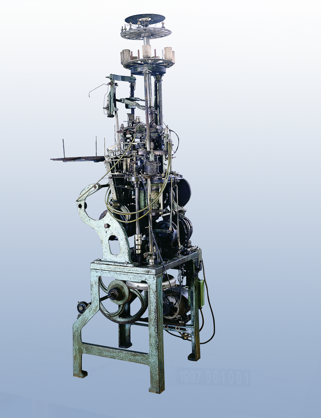 本館典藏的「全自動吊花織襪機」是1949年吳德生先生引進日本25段式三色全自動提花機,增加鼓花的部份成為26段織襪機,1969年取得專利權後以吳德生姓名縮寫WS-26為此機命名。1997年捐贈本館,常設展出於工業史蹟館,記錄著臺灣織襪工業的歷史。
